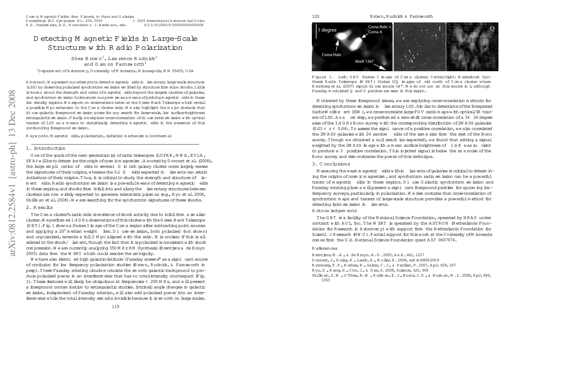 This paper investigates the detection of magnetic fields in large-scale structures using polarized synchrotron emission from structure formation shocks, revealing a possible megaparsec extension in the Coma cluster relic with the Green Bank Telescope. The study also addresses the challenge of galactic foreground emission and explores cross-correlation with optical tracers to statistically detect magnetic fields.