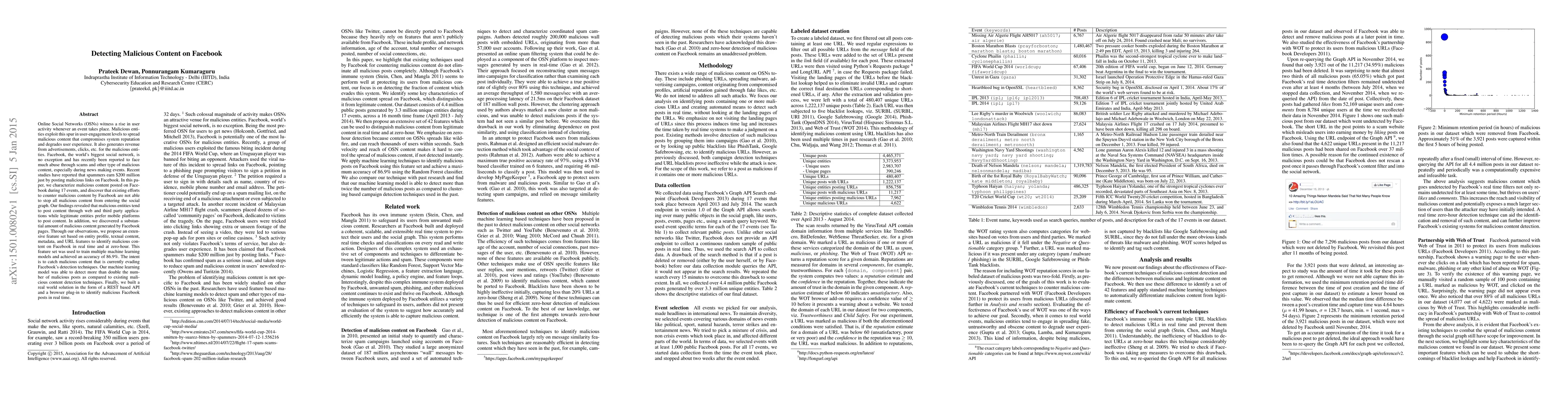 This paper characterizes malicious content on Facebook during 17 significant events, revealing that current detection methods are insufficient. The authors propose an advanced feature set and machine learning model achieving 86.9% accuracy, detecting more malicious posts than existing methods, and develop a real-time detection API and browser plug-in.