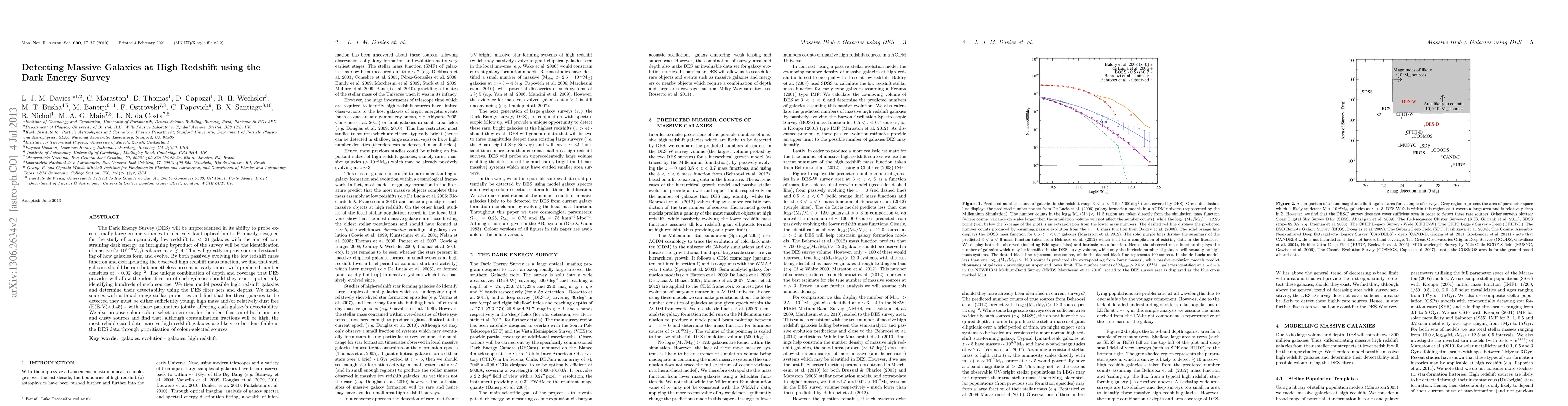 The Dark Energy Survey (DES) aims to detect massive galaxies at high redshifts (z>~4), enhancing our understanding of galaxy formation and evolution. DES's depth and coverage enable the identification of rare, potentially hundreds of such galaxies, which must be young, high mass, and relatively dust-free for detection. Colour-colour selection criteria are proposed to prioritize the most reliable candidates despite high contamination fractions.
