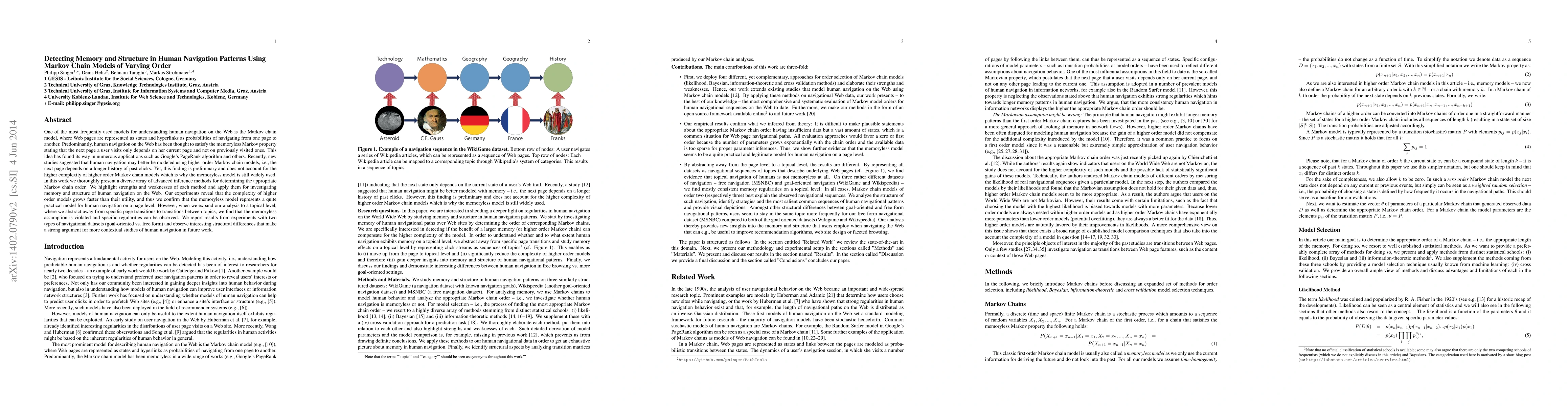 One of the most frequently used models for understanding human navigation on the Web is the Markov chain model, where Web pages are represented as states and hyperlinks as probabilities of navigating from one page to another. Predominantly, human navigation on the Web has been thought to satisfy the memoryless Markov property stating that the next page a user visits only depends on her current page and not on previously visited ones. This idea has found its way in numerous applications such as Google's PageRank algorithm and others. Recently, new studies suggested that human navigation may better be modeled using higher order Markov chain models, i.e., the next page depends on a longer history of past clicks. Yet, this finding is preliminary and does not account for the higher complexity of higher order Markov chain models which is why the memoryless model is still widely used. In this work we thoroughly present a diverse array of advanced inference methods for determining the appropriate Markov chain order. We highlight strengths and weaknesses of each method and apply them for investigating memory and structure of human navigation on the Web. Our experiments reveal that the complexity of higher order models grows faster than their utility, and thus we confirm that the memoryless model represents a quite practical model for human navigation on a page level. However, when we expand our analysis to a topical level, where we abstract away from specific page transitions to transitions between topics, we find that the memoryless assumption is violated and specific regularities can be observed. We report results from experiments with two types of navigational datasets (goal-oriented vs. free form) and observe interesting structural differences that make a strong argument for more contextual studies of human navigation in future work.