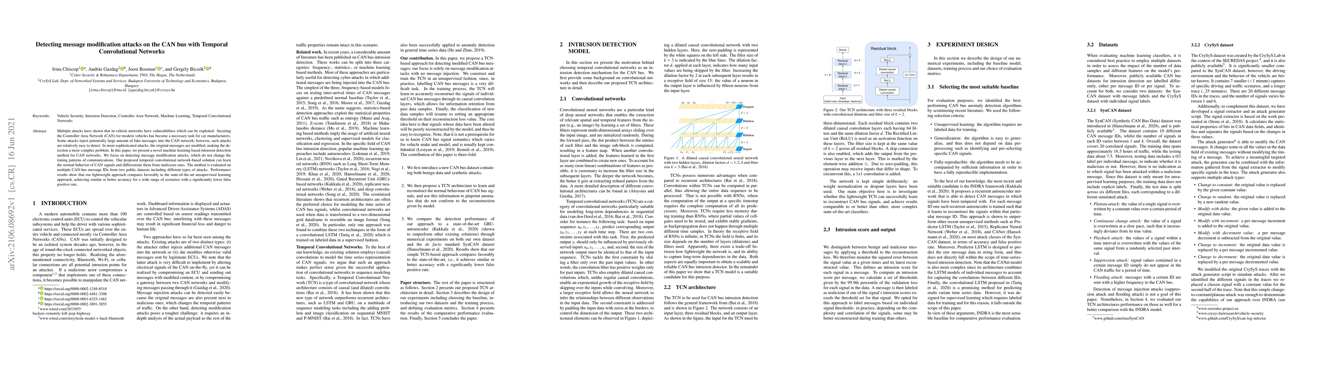 A novel machine learning-based method detects message modification attacks on CAN bus networks, outperforming state-of-the-art unsupervised learning approaches with lower false positive rates.