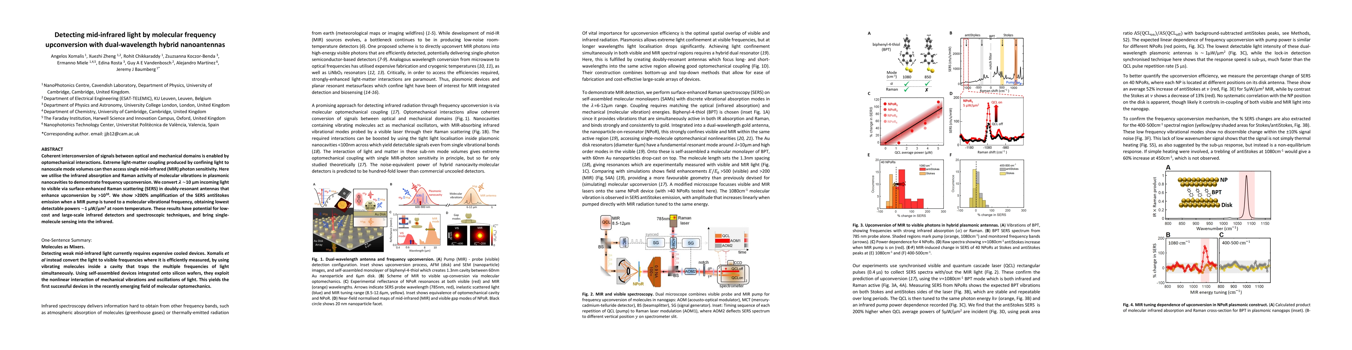 Coherent interconversion of signals between optical and mechanical domains is enabled by optomechanical interactions. Extreme light-matter coupling produced by confining light to nanoscale mode volumes can then access single mid-infrared (MIR) photon sensitivity. Here we utilise the infrared absorption and Raman activity of molecular vibrations in plasmonic nanocavities to demonstrate frequency upconversion. We convert {\lambda}~10 {\mu}m incoming light to visible via surface-enhanced Raman scattering (SERS) in doubly-resonant antennas that enhance upconversion by >10^10. We show >200% amplification of the SERS antiStokes emission when a MIR pump is tuned to a molecular vibrational frequency, obtaining lowest detectable powers ~1 {\mu}W/{\mu}m^2 at room temperature. These results have potential for low-cost and large-scale infrared detectors and spectroscopic techniques, and bring single-molecule sensing into the infrared