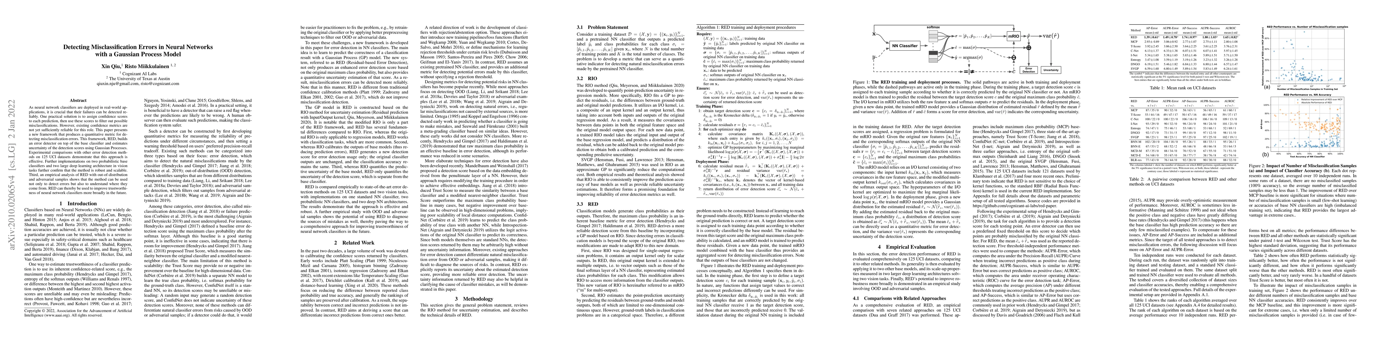 This paper introduces RED, a framework that uses Gaussian Processes to detect misclassification errors in neural networks by estimating uncertainty in detection scores. Experimental results show that RED is effective across various datasets and scales well with different classifiers and deep learning architectures.