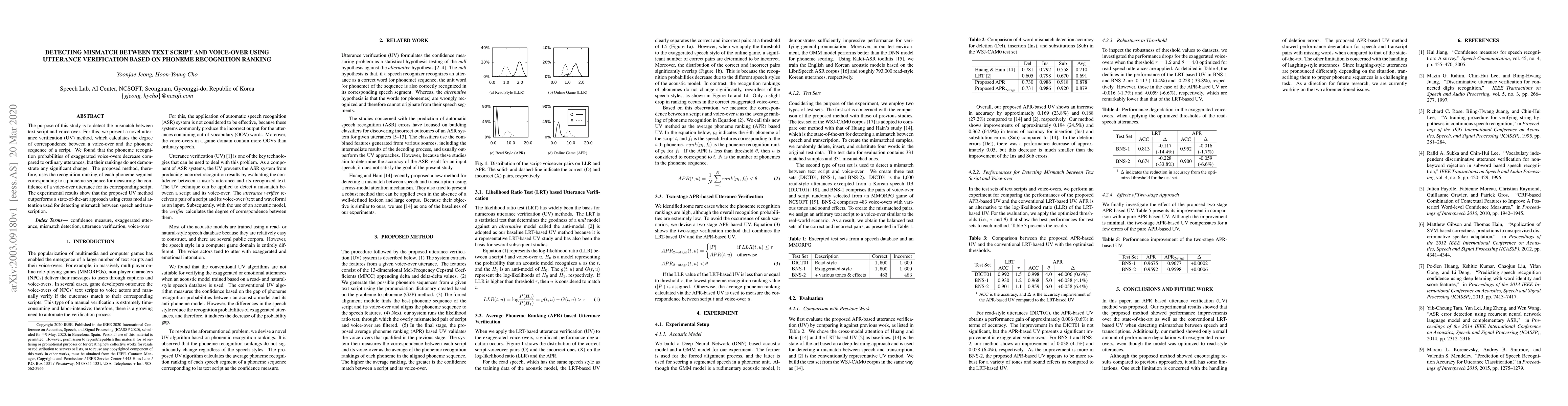 This study introduces a novel utterance verification method to detect mismatches between text scripts and voice-overs by ranking phoneme recognition probabilities. The method outperforms existing cross-modal attention techniques, especially for exaggerated voice-overs.