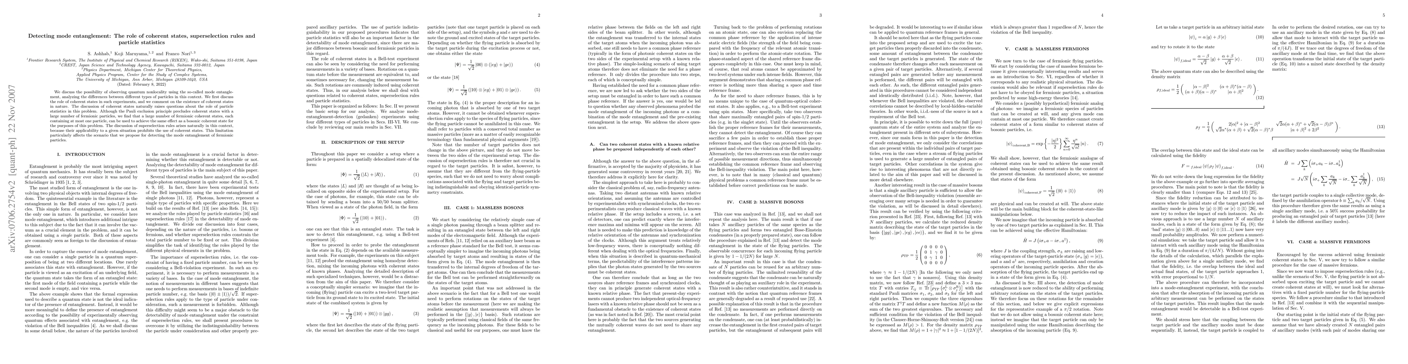 We discuss the possibility of observing quantum nonlocality using the so-called mode entanglement, analyzing the differences between different types of particles in this context. We first discuss the role of coherent states in such experiments, and we comment on the existence of coherent states in nature. The discussion of coherent states naturally raises questions about the role of particle statistics in this problem. Although the Pauli exclusion principle precludes coherent states with a large number of fermionic particles, we find that a large number of fermionic coherent states, each containing at most one particle, can be used to achieve the same effect as a bosonic coherent state for the purposes of this problem. The discussion of superselection rules arises naturally in this context, because their applicability to a given situation prohibits the use of coherent states. This limitation particularly affects the scenario that we propose for detecting the mode entanglement of fermionic particles.