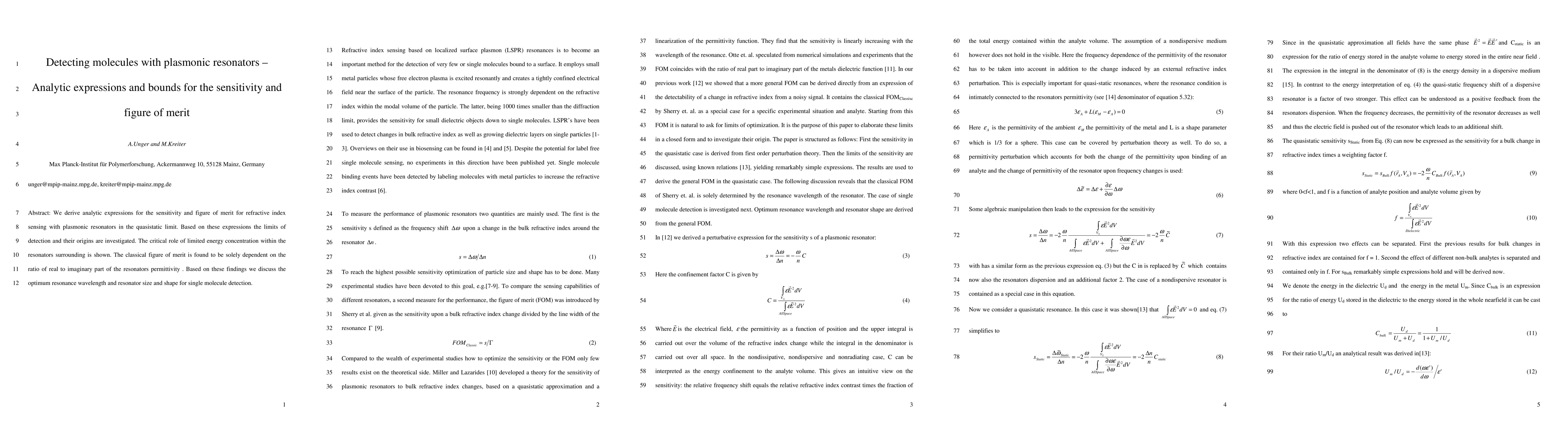 This paper derives analytic expressions for sensitivity and figure of merit in plasmonic resonators for refractive index sensing, revealing that the classical figure of merit depends on the ratio of the real to imaginary part of the resonator's permittivity. It discusses optimal resonance wavelength and resonator dimensions for detecting single molecules.