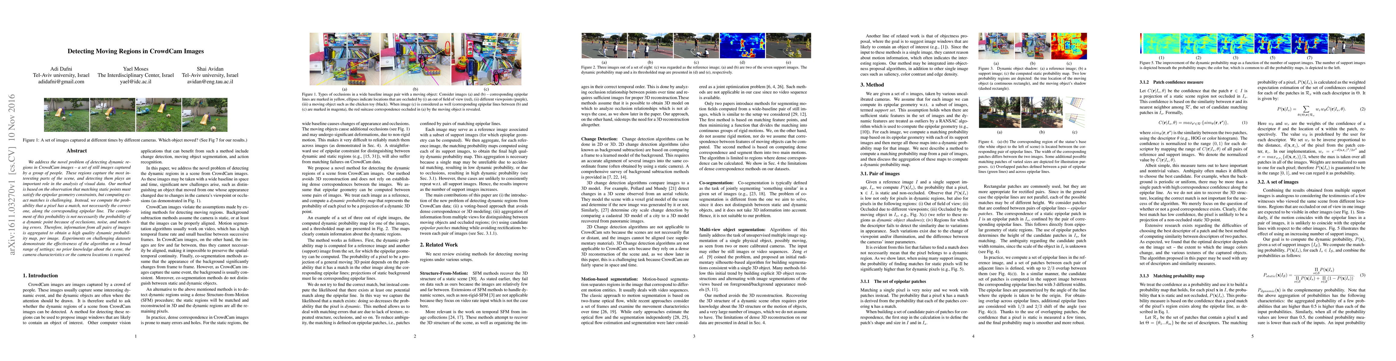 We address the novel problem of detecting dynamic regions in CrowdCam images, a set of still images captured by a group of people. These regions capture the most interesting parts of the scene, and detecting them plays an important role in the analysis of visual data. Our method is based on the observation that matching static points must satisfy the epipolar geometry constraints, but computing exact matches is challenging. Instead, we compute the probability that a pixel has a match, not necessarily the correct one, along the corresponding epipolar line. The complement of this probability is not necessarily the probability of a dynamic point because of occlusions, noise, and matching errors. Therefore, information from all pairs of images is aggregated to obtain a high quality dynamic probability map, per image. Experiments on challenging datasets demonstrate the effectiveness of the algorithm on a broad range of settings; no prior knowledge about the scene, the camera characteristics or the camera locations is required.