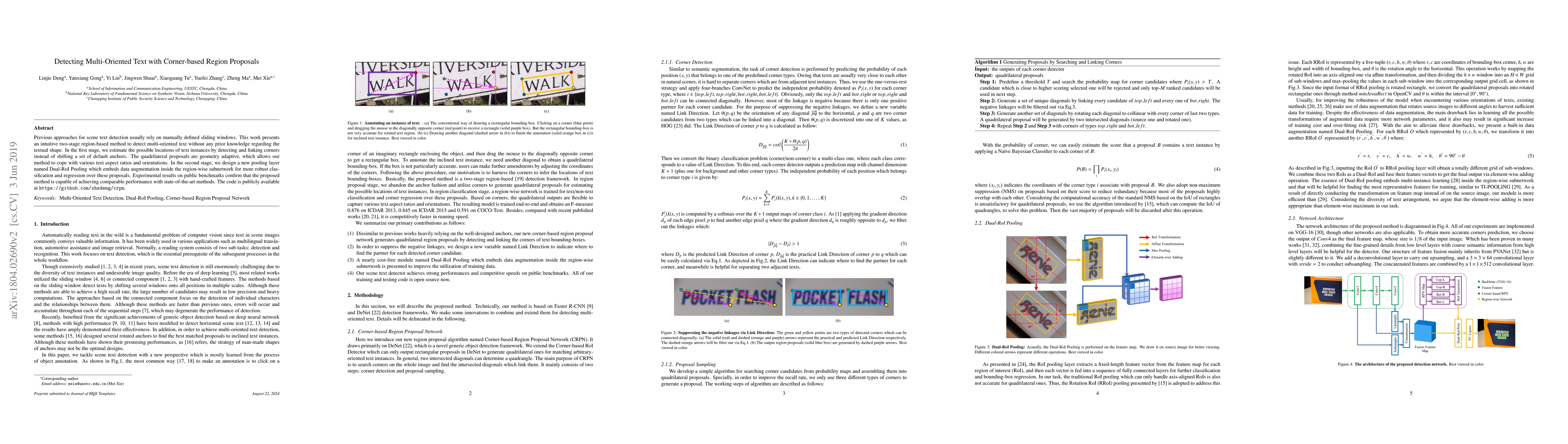 Previous approaches for scene text detection usually rely on manually defined sliding windows. This work presents an intuitive two-stage region-based method to detect multi-oriented text without any prior knowledge regarding the textual shape. In the first stage, we estimate the possible locations of text instances by detecting and linking corners instead of shifting a set of default anchors. The quadrilateral proposals are geometry adaptive, which allows our method to cope with various text aspect ratios and orientations. In the second stage, we design a new pooling layer named Dual-RoI Pooling which embeds data augmentation inside the region-wise subnetwork for more robust classification and regression over these proposals. Experimental results on public benchmarks confirm that the proposed method is capable of achieving comparable performance with state-of-the-art methods. The code is publicly available at https://github.com/xhzdeng/crpn