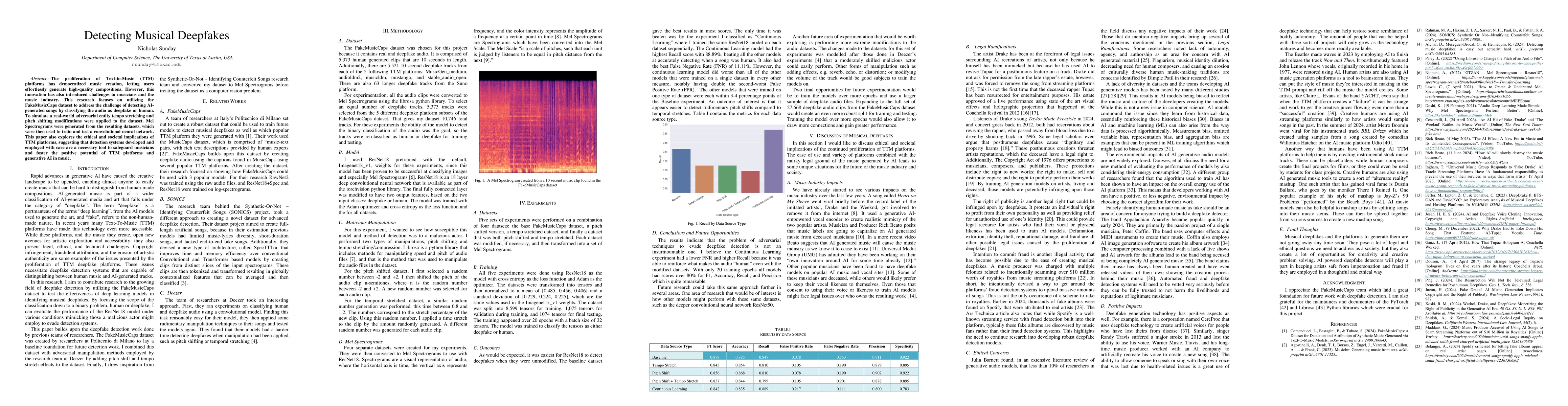 The proliferation of Text-to-Music (TTM) platforms has democratized music creation, enabling users to effortlessly generate high-quality compositions. However, this innovation also presents new challenges to musicians and the broader music industry. This study investigates the detection of AI-generated songs using the FakeMusicCaps dataset by classifying audio as either deepfake or human. To simulate real-world adversarial conditions, tempo stretching and pitch shifting were applied to the dataset. Mel spectrograms were generated from the modified audio, then used to train and evaluate a convolutional neural network. In addition to presenting technical results, this work explores the ethical and societal implications of TTM platforms, arguing that carefully designed detection systems are essential to both protecting artists and unlocking the positive potential of generative AI in music.