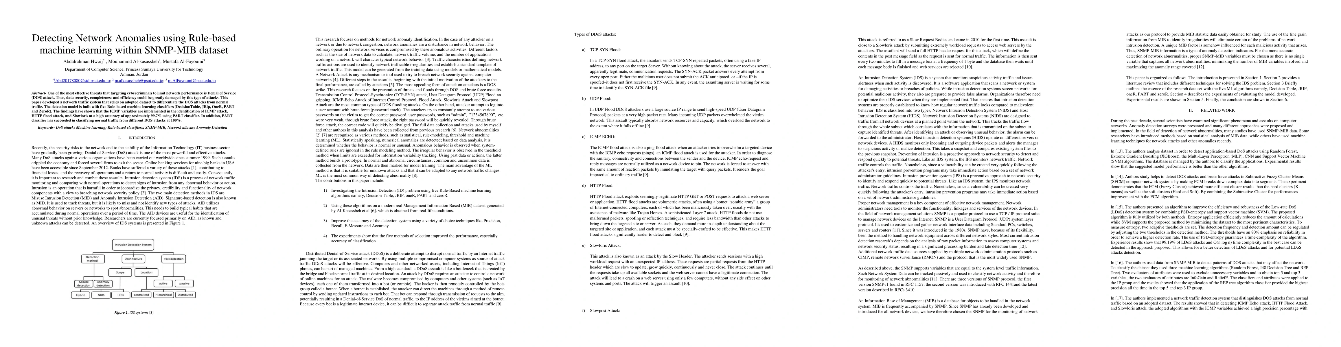 One of the most effective threats that targeting cybercriminals to limit network performance is Denial of Service (DOS) attack. Thus, data security, completeness and efficiency could be greatly damaged by this type of attacks. This paper developed a network traffic system that relies on adopted dataset to differentiate the DOS attacks from normal traffic. The detection model is built with five Rule-based machine learning classifiers (DecisionTable, JRip, OneR, PART and ZeroR). The findings have shown that the ICMP variables are implemented in the identification of ICMP attack, HTTP flood attack, and Slowloris at a high accuracy of approximately 99.7% using PART classifier. In addition, PART classifier has succeeded in classifying normal traffic from different DOS attacks at 100%.
