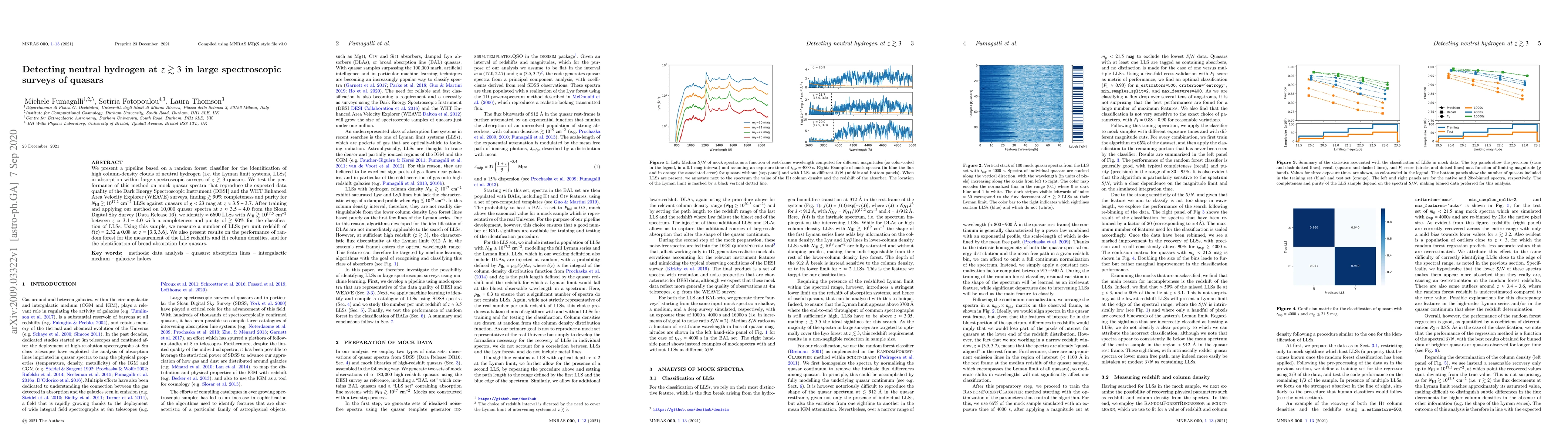 We present a pipeline based on a random forest classifier for the identification of high column-density clouds of neutral hydrogen (i.e. the Lyman limit systems, LLSs) in absorption within large spectroscopic surveys of z>3 quasars. We test the performance of this method on mock quasar spectra that reproduce the expected data quality of the Dark Energy Spectroscopic Instrument (DESI) and the WHT Enhanced Area Velocity Explorer (WEAVE) surveys, finding >90% completeness and purity for N(HI)> 10^17.2 cm^-2 LLSs against quasars of g < 23 mag at z~3.5-3.7. After training and applying our method on 10,000 quasar spectra at z~3.5-4.0 from the Sloan Digital Sky Survey (Data Release 16), we identify ~6600 LLSs with N(HI)>10^17.5 cm^-2 between z~3.1-4.0 with a completeness and purity of >90% for the classification of LLSs. Using this sample, we measure a number of LLSs per unit redshift of 2.32 +/- 0.08 at z=[3.3,3.6]. We also present results on the performance of random forest for the measurement of the LLS redshifts and HI column densities, and for the identification of broad absorption line quasars.