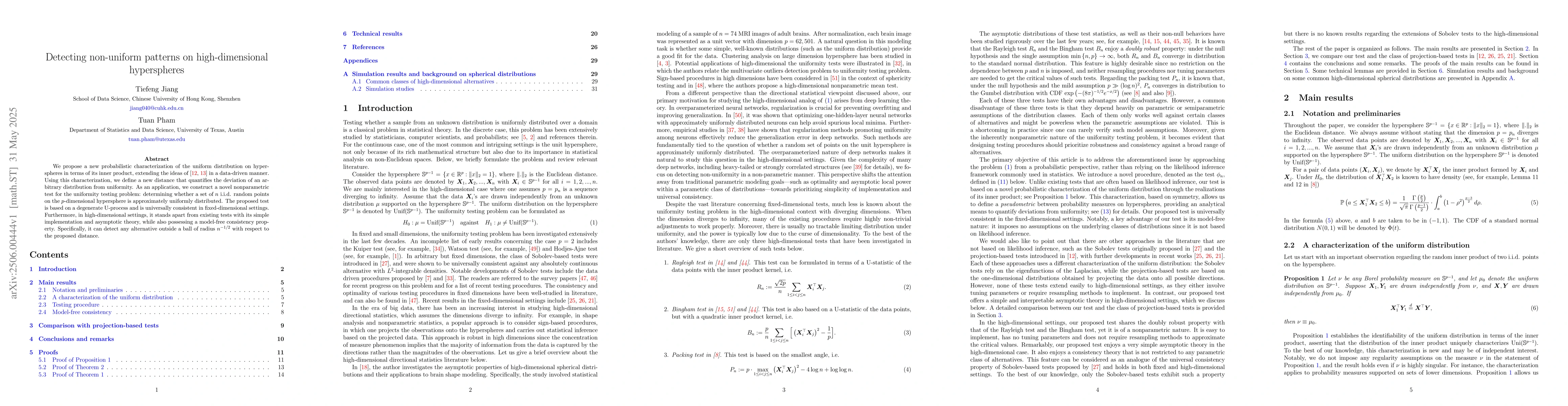 This paper proposes a new method to detect non-uniform patterns on high-dimensional hyperspheres, providing a simple and model-free test for uniformity that can detect alternatives outside a small radius in high dimensions.