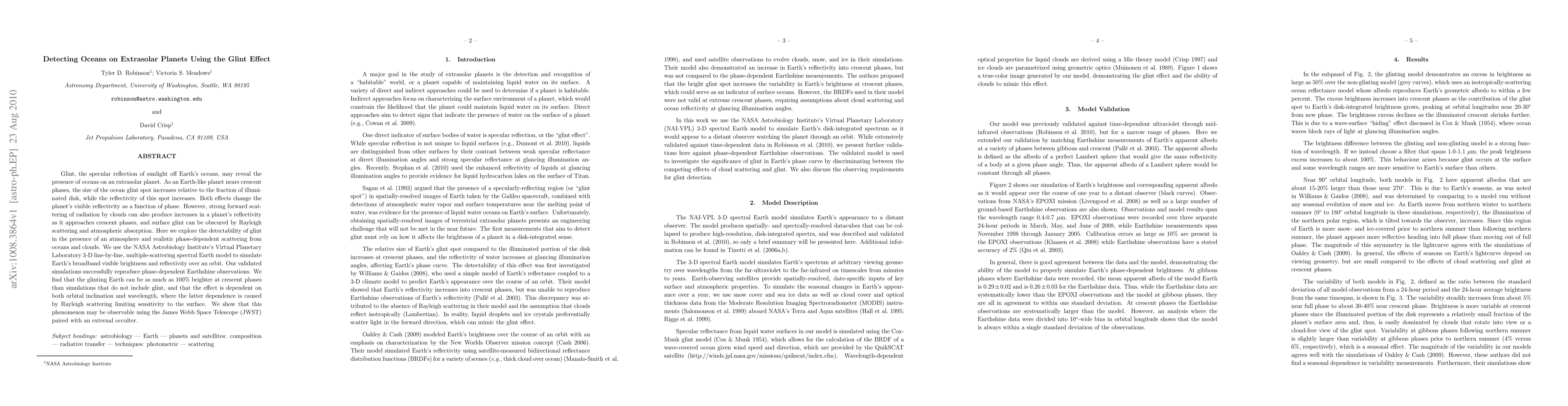 This paper investigates the potential of detecting oceans on extrasolar planets through the glint effect, the specular reflection of sunlight off planetary oceans. Simulations using a validated Earth model show that ocean glint can significantly increase a planet's visible brightness during crescent phases, making it potentially observable with the James Webb Space Telescope.