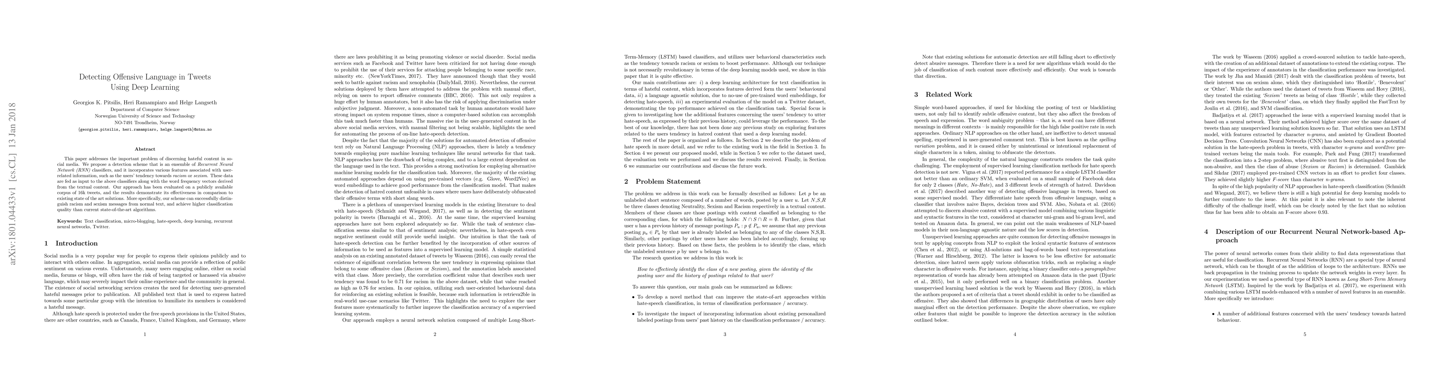 This paper proposes an ensemble of RNN classifiers to detect offensive language in tweets, incorporating user-related features and word frequency vectors. The method outperforms existing solutions, effectively distinguishing racist and sexist messages from normal text.