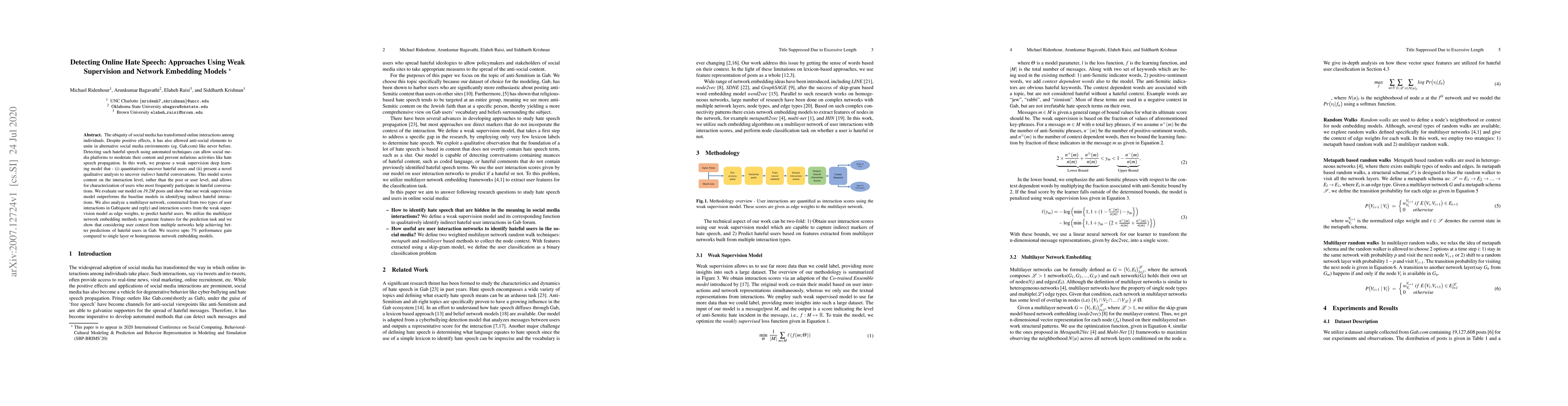 This paper proposes a weak supervision deep learning model to detect online hate speech, focusing on uncovering hateful users and indirect hateful conversations. The model outperforms baselines and achieves a 7% performance gain by utilizing multilayer network embedding methods that consider user context from multiple interaction networks.