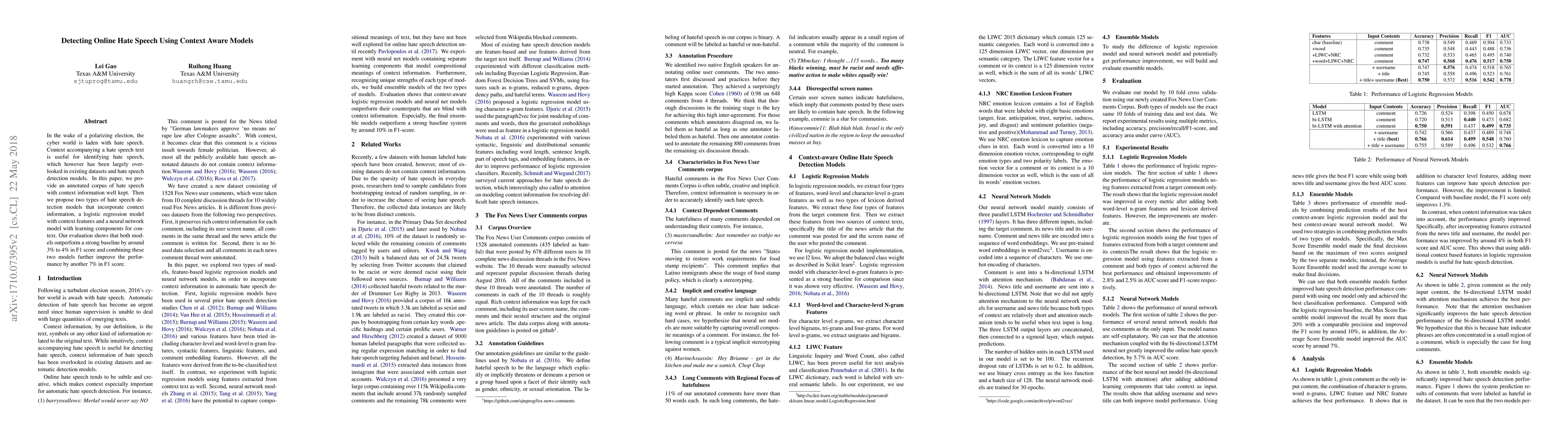 This paper introduces an annotated corpus of hate speech enriched with context information and proposes two context-aware models—a logistic regression model and a neural network model—to detect hate speech. Both models significantly outperform a baseline, with the combined model achieving a notable 7% improvement in F1 score.