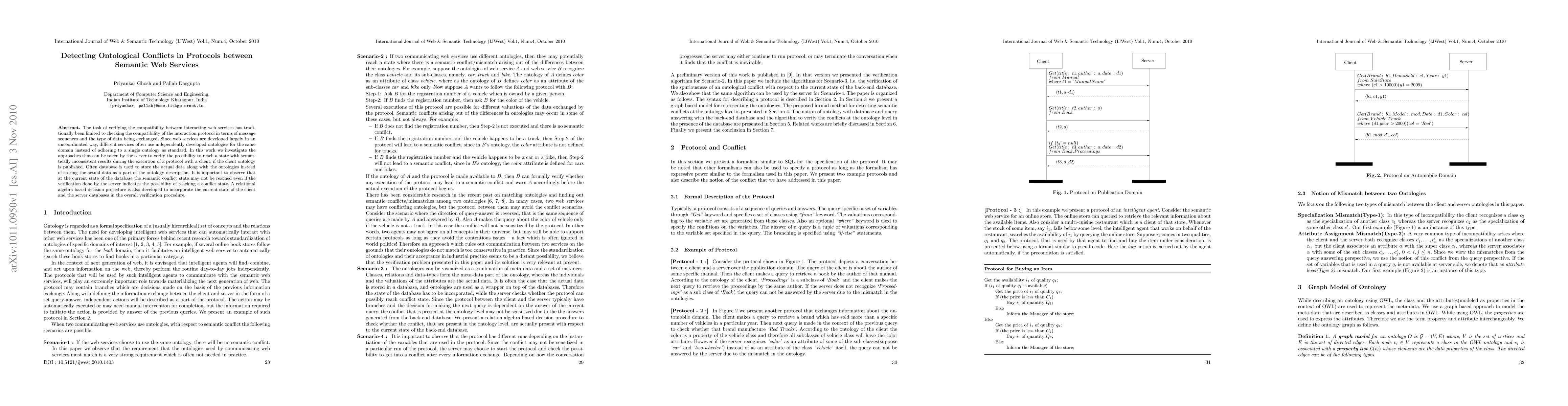 The task of verifying the compatibility between interacting web services has traditionally been limited to checking the compatibility of the interaction protocol in terms of message sequences and the type of data being exchanged. Since web services are developed largely in an uncoordinated way, different services often use independently developed ontologies for the same domain instead of adhering to a single ontology as standard. In this work we investigate the approaches that can be taken by the server to verify the possibility to reach a state with semantically inconsistent results during the execution of a protocol with a client, if the client ontology is published. Often database is used to store the actual data along with the ontologies instead of storing the actual data as a part of the ontology description. It is important to observe that at the current state of the database the semantic conflict state may not be reached even if the verification done by the server indicates the possibility of reaching a conflict state. A relational algebra based decision procedure is also developed to incorporate the current state of the client and the server databases in the overall verification procedure.