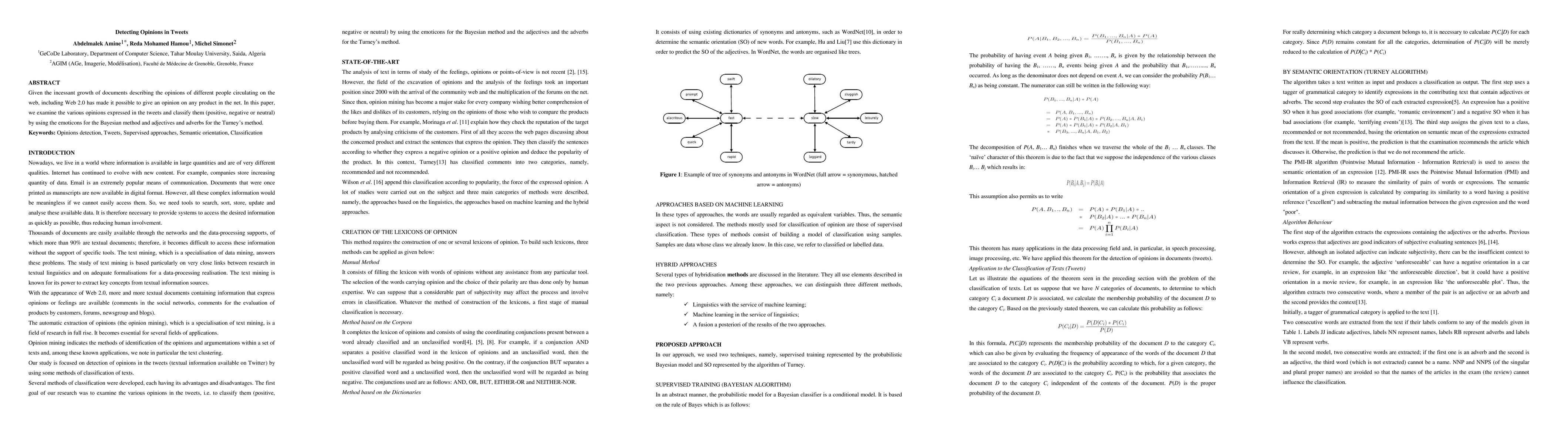 Given the incessant growth of documents describing the opinions of different people circulating on the web, including Web 2.0 has made it possible to give an opinion on any product in the net. In this paper, we examine the various opinions expressed in the tweets and classify them positive, negative or neutral by using the emoticons for the Bayesian method and adjectives and adverbs for the Turney's method