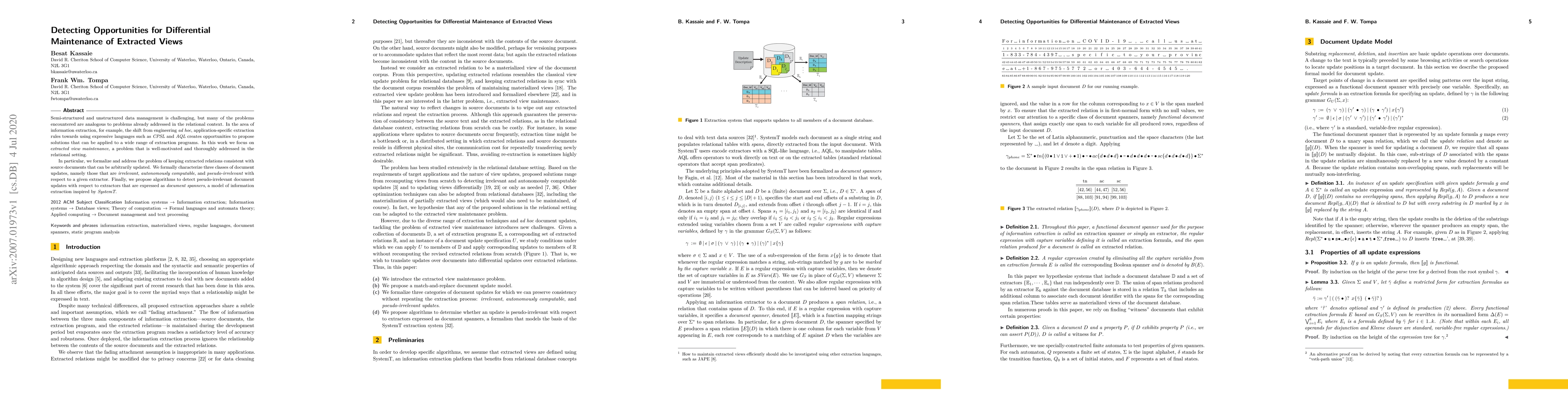 This research proposes solutions for maintaining consistency between extracted relations and source documents, which can be updated in any way. It identifies three update classes: irrelevant, autonomously computable, and pseudo-irrelevant. The paper focuses on detecting pseudo-irrelevant updates using algorithms designed for extractors modeled as document spanners, inspired by SystemT.
