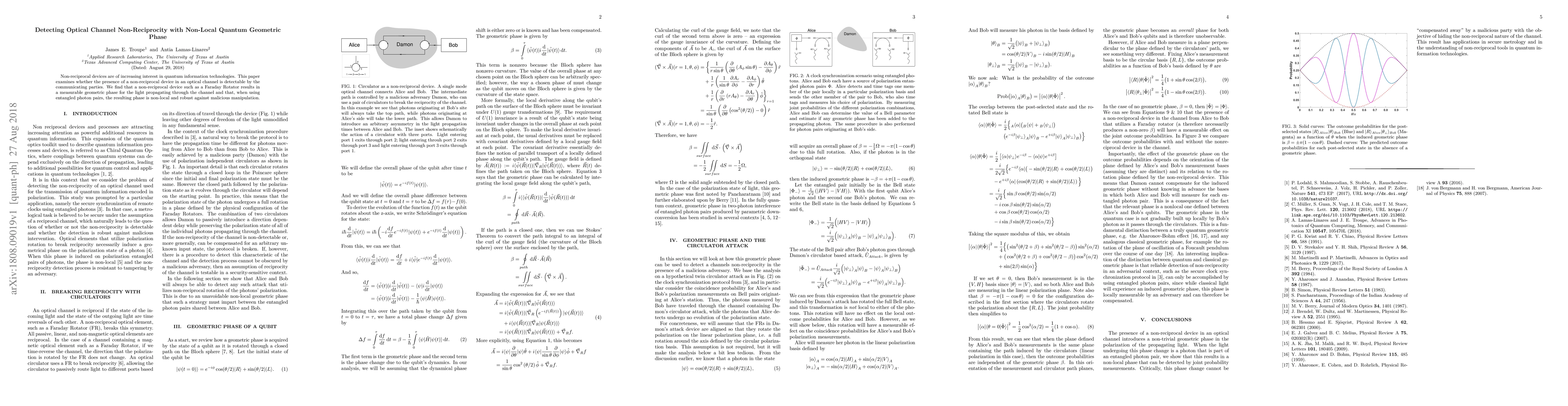 Non-reciprocal devices are of increasing interest in quantum information technologies. This paper examines whether the presence of a non-reciprocal device in an optical channel is detectable by the communicating parties. We find that a non-reciprocal device such as a Faraday Rotator results in a measurable geometric phase for the light propagating through the channel and that, when using entangled photon pairs, the resulting phase is non-local and robust against malicious manipulation.