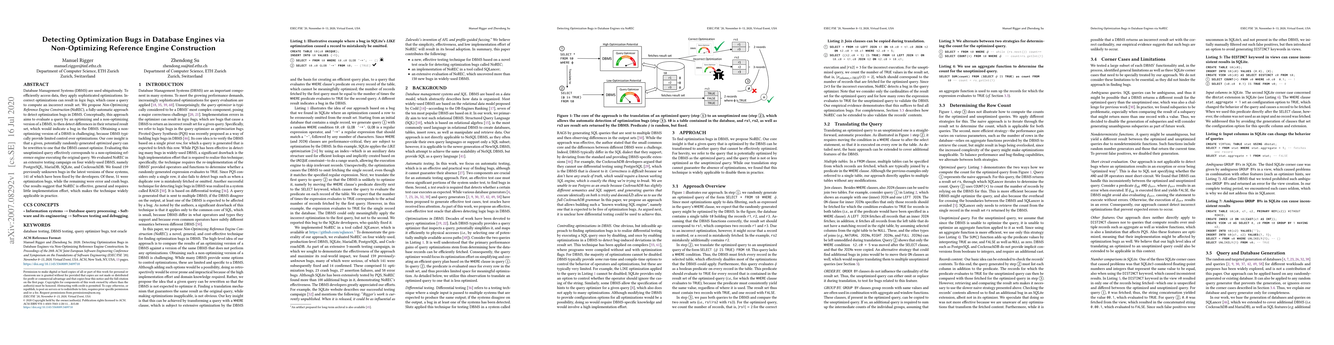 This paper proposes a general, highly-effective approach for detecting bugs in DBMS, which is termed Non-Optimizing Refer-ence Engine Construction (NoREC).