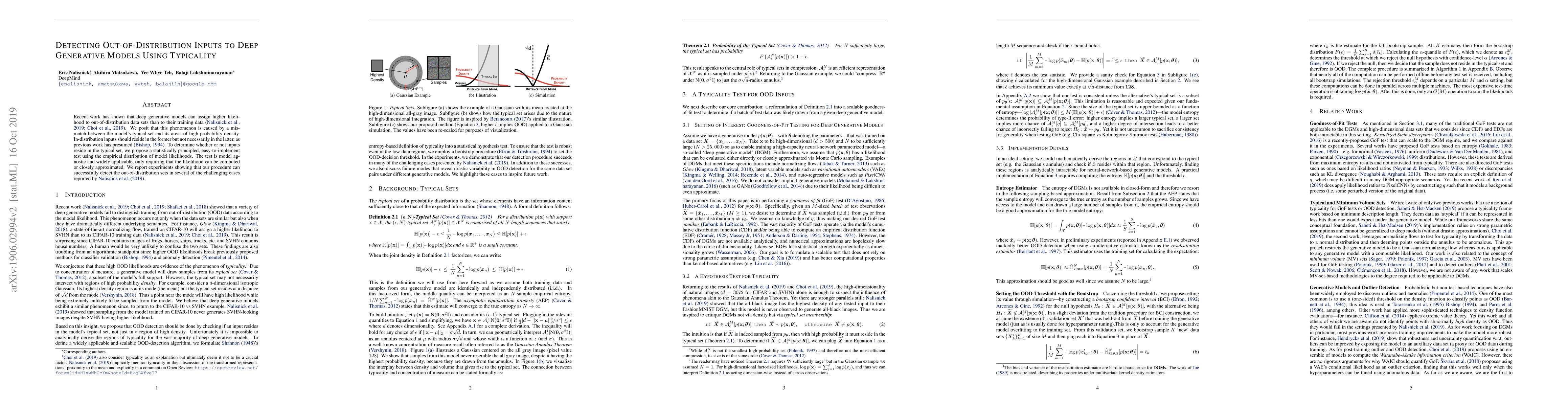 This paper proposes a method to detect out-of-distribution inputs for deep generative models by assessing whether inputs fall within the model's typical set, using a statistically principled test based on the empirical distribution of model likelihoods. The method is model agnostic and successfully identifies out-of-distribution data in several challenging cases.