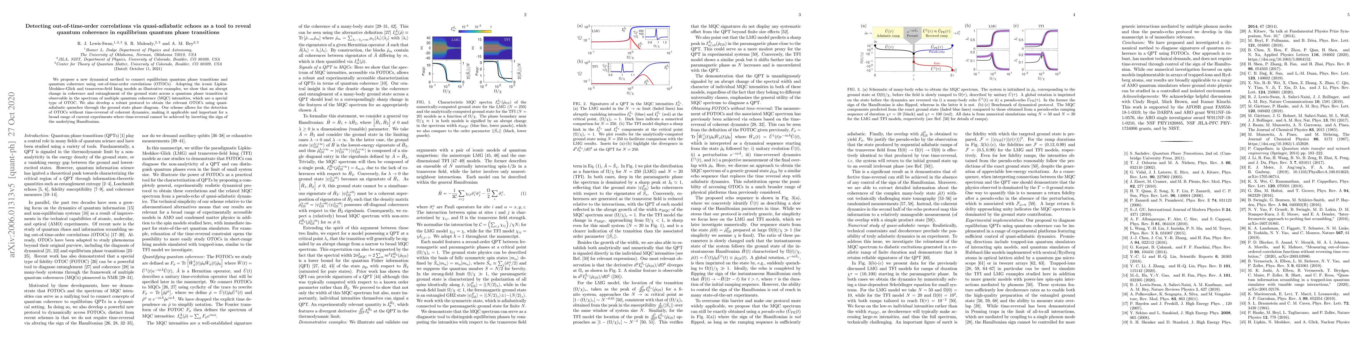 We propose a new dynamical method to connect equilibrium quantum phase transitions and quantum coherence using out-of-time-order correlations (OTOCs). Adopting the iconic Lipkin-Meshkov-Glick and transverse-field Ising models as illustrative examples, we show that an abrupt change in coherence and entanglement of the ground state across a quantum phase transition is observable in the spectrum of multiple quantum coherence (MQC) intensities, which are a special type of OTOC. We also develop a robust protocol to obtain the relevant OTOCs using quasi-adiabatic quenches through the ground state phase diagram. Our scheme allows for the detection of OTOCs without time-reversal of coherent dynamics, making it applicable and important for a broad range of current experiments where time-reversal cannot be achieved by inverting the sign of the underlying Hamiltonian.