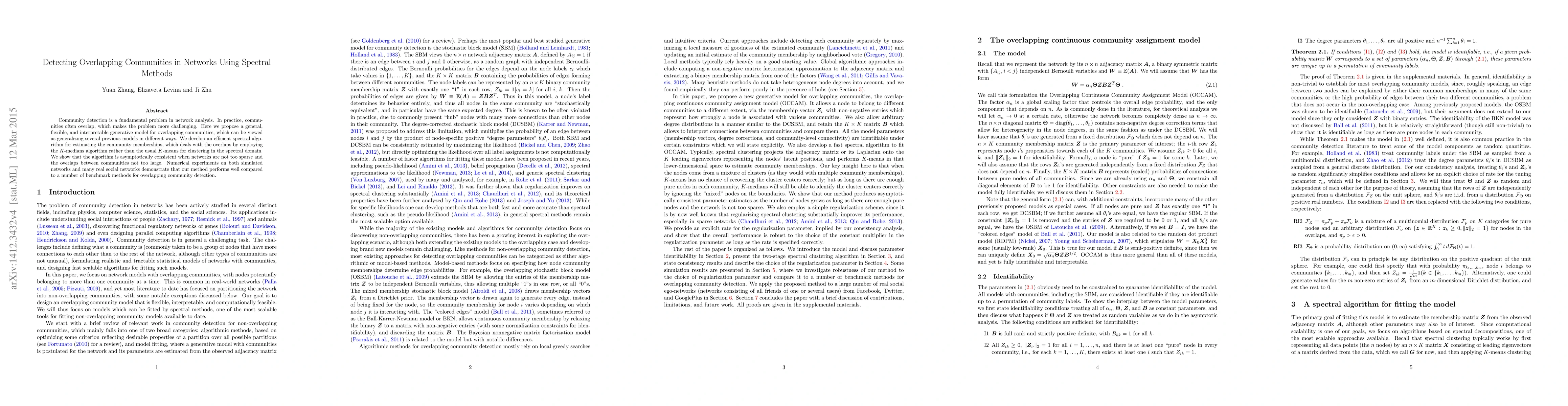This paper proposes a generative model for detecting overlapping communities in networks, generalizing the degree-corrected stochastic block model. It introduces a spectral algorithm using K-medians for clustering, demonstrating strong performance on both simulated and real social networks, and showing consistency under certain network conditions.
