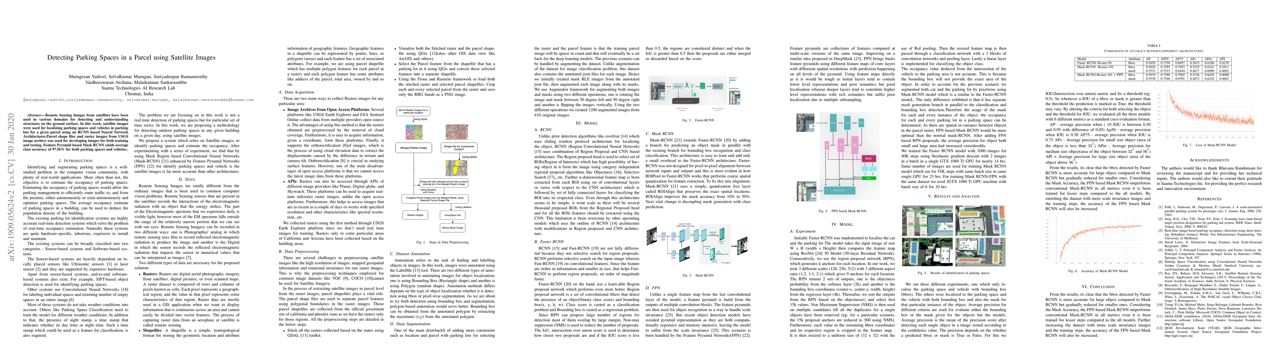 This research utilizes satellite images and an RCNN-based neural network to localize parking spaces and vehicles in parking lots. The study achieves an average class accuracy of 97.56% using a Feature Pyramid-based Mask RCNN model trained on parcel shapefiles and USGS raster images.