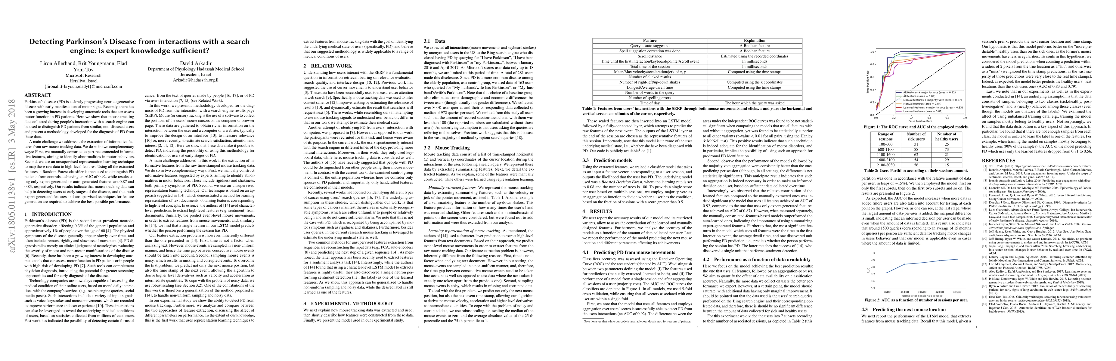 Parkinson's disease (PD) is a slowly progressing neurodegenerative disease with early manifestation of motor signs. Recently, there has been a growing interest in developing automatic tools that can assess motor function in PD patients. Here we show that mouse tracking data collected during people's interaction with a search engine can be used to distinguish PD patients from similar, non-diseased users and present a methodology developed for the diagnosis of PD from these data. A main challenge we address is the extraction of informative features from raw mouse tracking data. We do so in two complementary ways: First, we manually construct expert-recommended informative features, aiming to identify abnormalities in motor behaviors. Second, we use an unsupervised representation learning technique to map these raw data to high-level features. Using all the extracted features, a Random Forest classifier is then used to distinguish PD patients from controls, achieving an AUC of 0.92, while results using only expert-generated or auto-generated features are 0.87 and 0.83, respectively. Our results indicate that mouse tracking data can help in detecting users at early stages of the disease, and that both expert-generated features and unsupervised techniques for feature generation are required to achieve the best possible performance