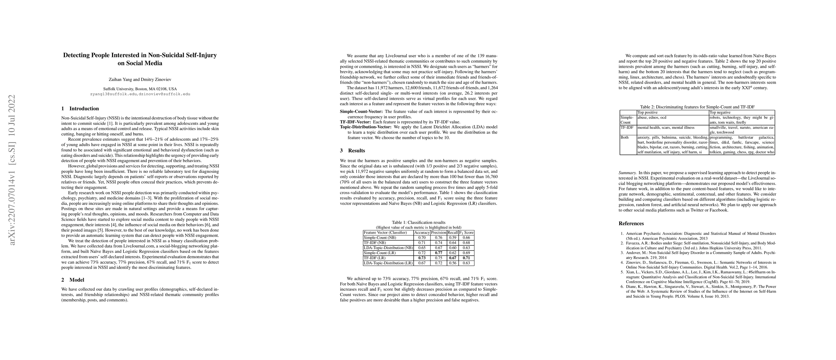 This paper proposes a supervised learning model to detect individuals interested in Non-Suicidal Self-Injury (NSSI) on social media, using binary classification based on self-declared interests. Experimental results on a LiveJournal dataset show the model's effectiveness in identifying such interests.
