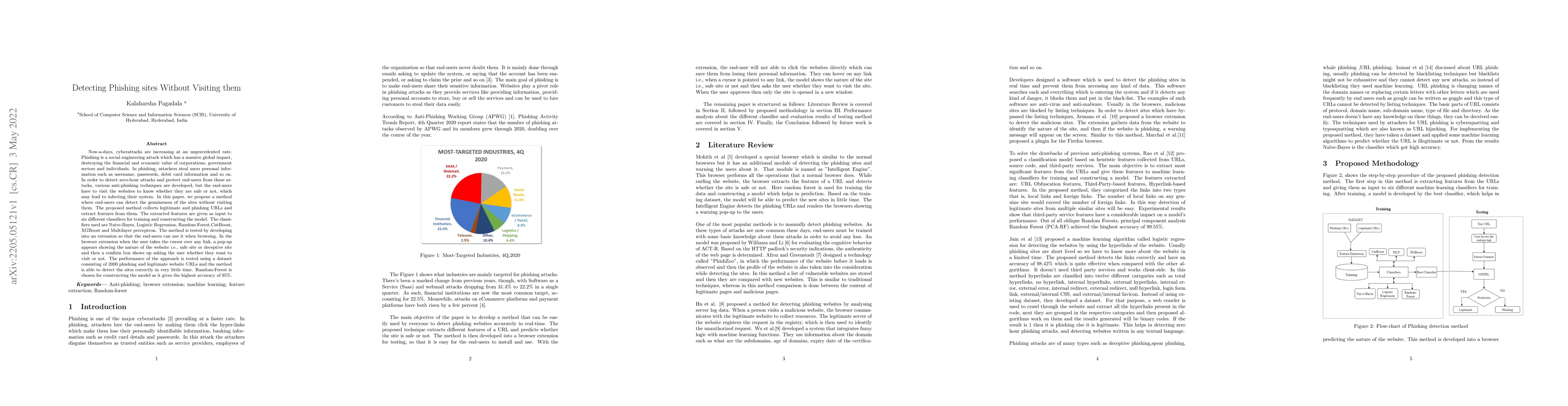 This paper proposes a method to detect phishing sites without requiring users to visit them, using extracted features from URLs and multiple classifiers. The best-performing Random Forest classifier achieves 95% accuracy, and a browser extension is developed to provide real-time phishing detection when users hover over links.