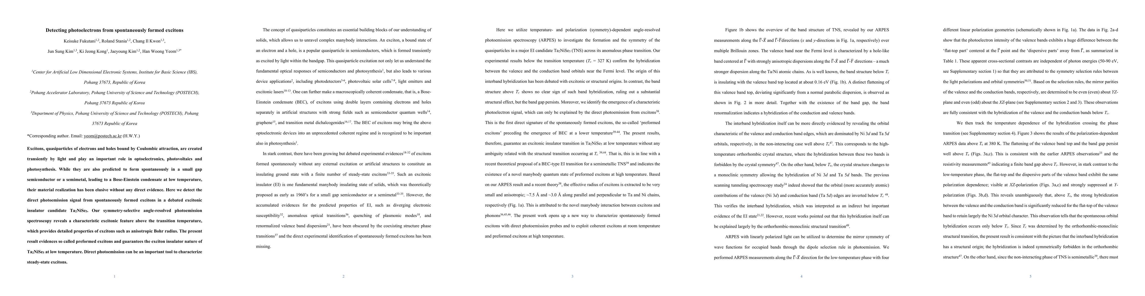 Researchers have detected photoelectrons from spontaneously formed excitons in Ta2NiSe5, a material that exhibits characteristics of an excitonic insulator at low temperatures. This discovery provides direct evidence for preformed excitons and highlights the potential of angle-resolved photoemission spectroscopy as a tool to characterize steady-state excitons.