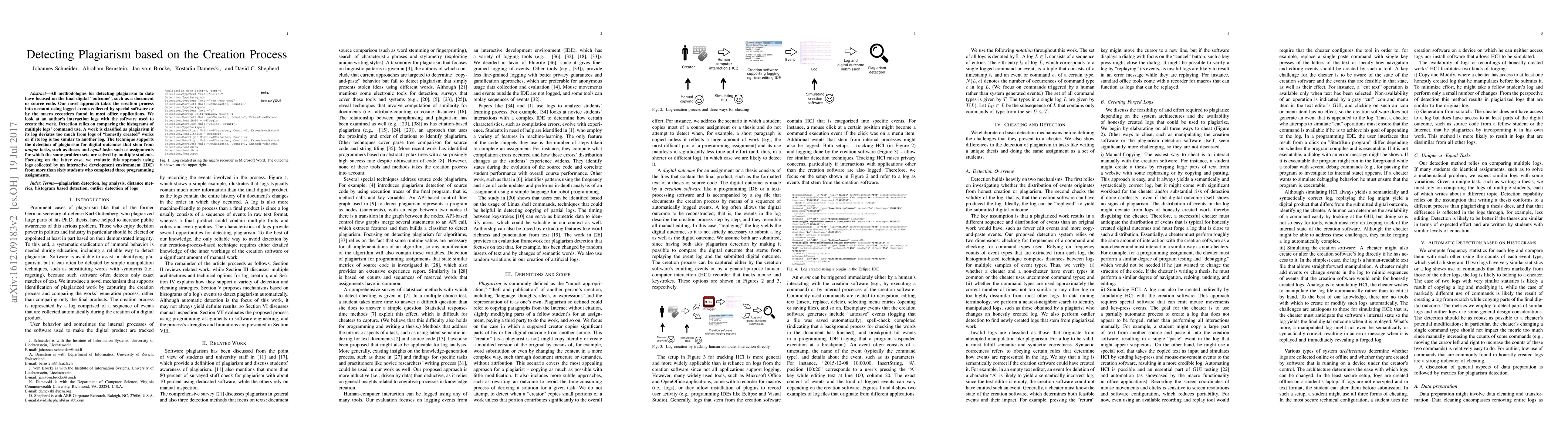 A new plagiarism detection method uses logged events to analyze an author's interaction with software, comparing command use patterns to identify deviating or similar logs indicative of plagiarism. The approach supports detecting plagiarism in unique digital outcomes like theses and assignments.