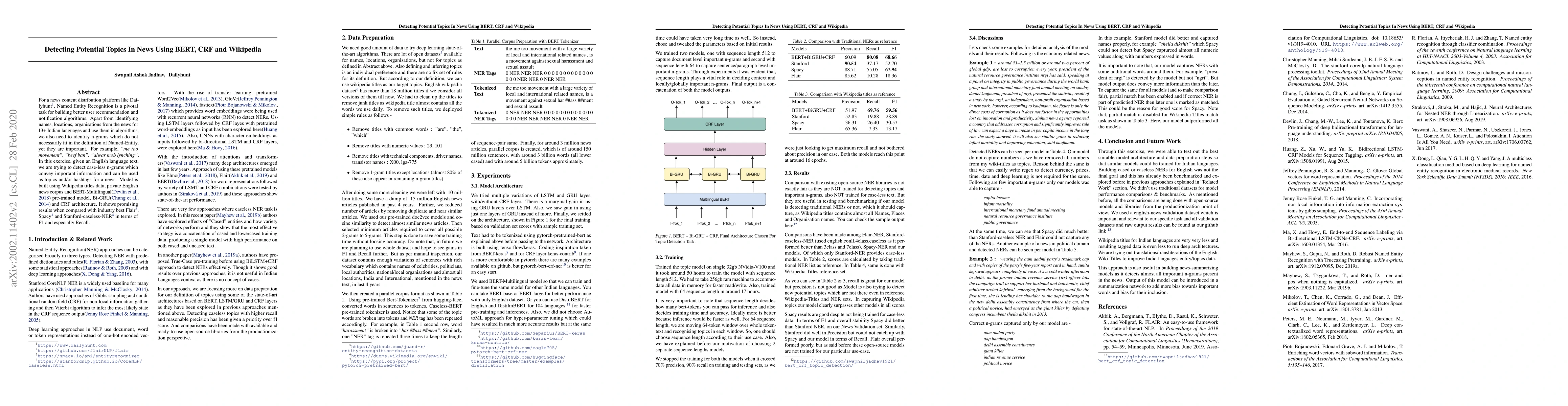 For a news content distribution platform like Dailyhunt, Named Entity Recognition is a pivotal task for building better user recommendation and notification algorithms. Apart from identifying names, locations, organisations from the news for 13+ Indian languages and use them in algorithms, we also need to identify n-grams which do not necessarily fit in the definition of Named-Entity, yet they are important. For example, "me too movement", "beef ban", "alwar mob lynching". In this exercise, given an English language text, we are trying to detect case-less n-grams which convey important information and can be used as topics and/or hashtags for a news. Model is built using Wikipedia titles data, private English news corpus and BERT-Multilingual pre-trained model, Bi-GRU and CRF architecture. It shows promising results when compared with industry best Flair, Spacy and Stanford-caseless-NER in terms of F1 and especially Recall.