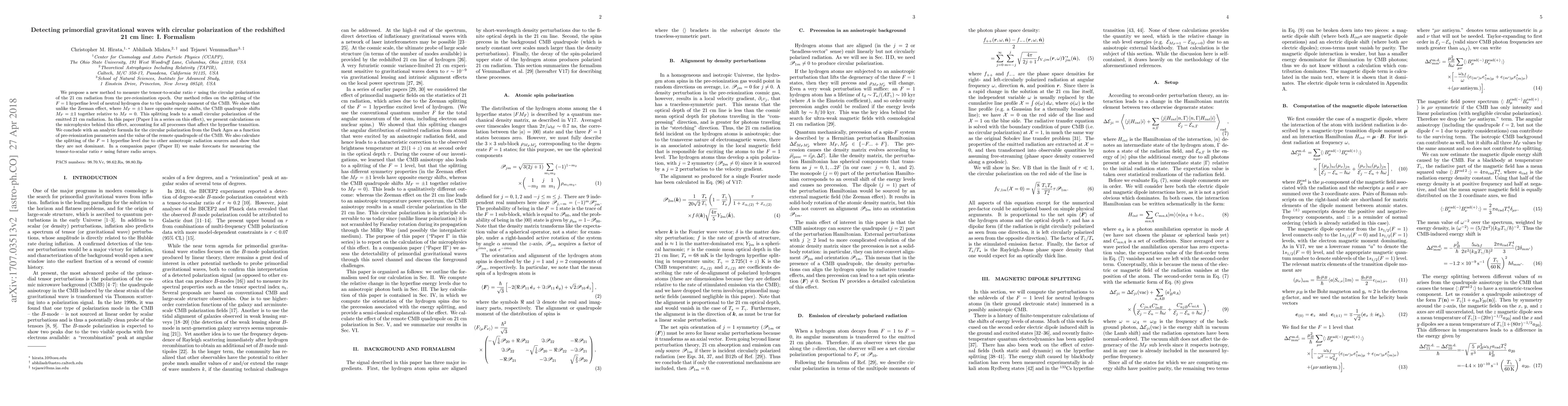 We propose a new method to measure the tensor-to-scalar ratio $r$ using the circular polarization of the 21 cm radiation from the pre-reionization epoch. Our method relies on the splitting of the $F = 1$ hyperfine level of neutral hydrogen due to the quadrupole moment of the CMB. We show that unlike the Zeeman effect, where $M_{F}=\pm 1$ have opposite energy shifts, the CMB quadrupole shifts $M_{F}=\pm 1$ together relative to $M_{F}= 0$. This splitting leads to a small circular polarization of the emitted 21 cm radiation. In this paper (Paper I in a series on this effect), we present calculations on the microphysics behind this effect, accounting for all processes that affect the hyperfine transition. We conclude with an analytic formula for the circular polarization from the Dark Ages as a function of pre-reionization parameters and the value of the remote quadrupole of the CMB. We also calculate the splitting of the $F = 1$ hyperfine level due to other anisotropic radiation sources and show that they are not dominant. In a companion paper (Paper II) we make forecasts for measuring the tensor-to-scalar ratio $r$ using future radio arrays.