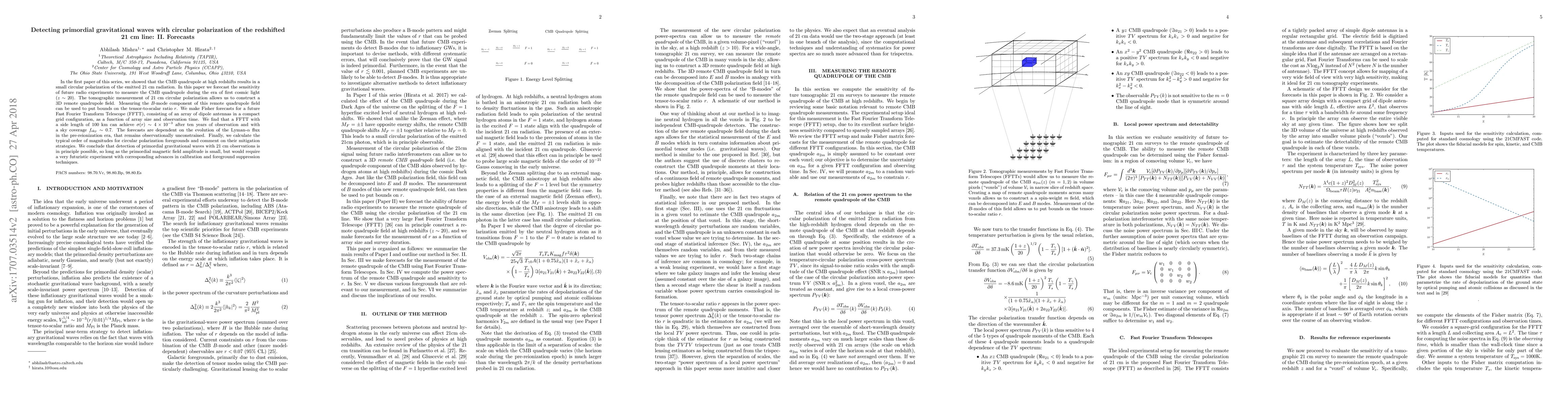 In the first paper of this series, we showed that the CMB quadrupole at high redshifts results in a small circular polarization of the emitted 21 cm radiation. In this paper we forecast the sensitivity of future radio experiments to measure the CMB quadrupole during the era of first cosmic light ($z\sim 20$). The tomographic measurement of 21 cm circular polarization allows us to construct a 3D remote quadrupole field. Measuring the $B$-mode component of this remote quadrupole field can be used to put bounds on the tensor-to-scalar ratio $r$. We make Fisher forecasts for a future Fast Fourier Transform Telescope (FFTT), consisting of an array of dipole antennas in a compact grid configuration, as a function of array size and observation time. We find that a FFTT with a side length of 100 km can achieve $\sigma(r)\sim 4\times 10^{-3}$ after ten years of observation and with a sky coverage $f_{\mathrm{sky}}\sim 0.7$. The forecasts are dependent on the evolution of the Lyman-$\alpha$ flux in the pre-reionization era, that remains observationally unconstrained. Finally, we calculate the typical order of magnitudes for circular polarization foregrounds and comment on their mitigation strategies. We conclude that detection of primordial gravitational waves with 21 cm observations is in principle possible, so long as the primordial magnetic field amplitude is small, but would require a very futuristic experiment with corresponding advances in calibration and foreground suppression techniques.