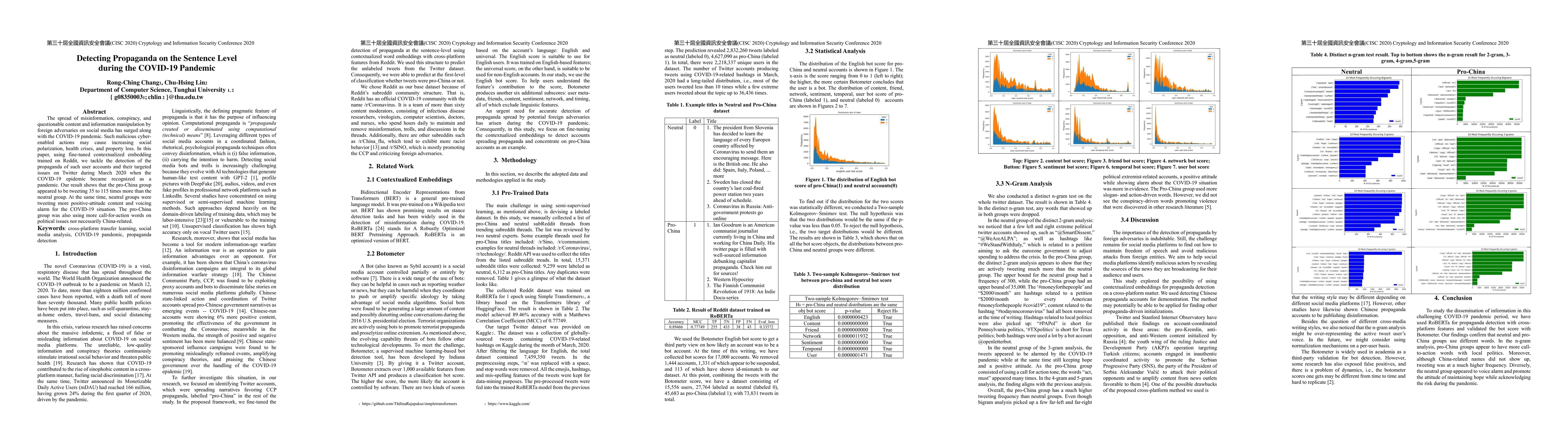 This paper investigates the use of fine-tuned contextualized embeddings to detect propaganda on Twitter during the COVID-19 pandemic, finding that pro-China groups tweeted significantly more than neutral groups, often using call-to-action language on unrelated political issues. Neutral groups focused more on positive content and expressed concern about the pandemic.