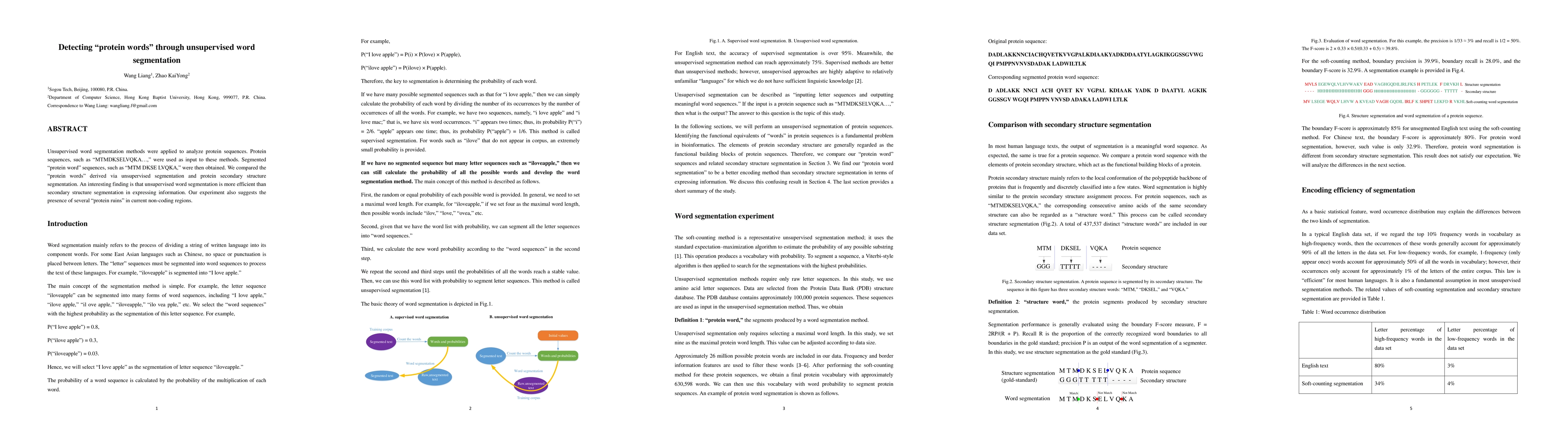 Unsupervised word segmentation methods were applied to analyze the protein sequence. Protein sequences, such as 'MTMDKSELVQKA...', were used as input to these methods. Segmented 'protein word' sequences, such as 'MTM DKSE LVQKA', were then obtained. We compare the 'protein words' produced by unsupervised segmentation and the protein secondary structure segmentation. An interesting finding is that the unsupervised word segmentation is more efficient than secondary structure segmentation in expressing information. Our experiment also suggests there may be some 'protein ruins' in current noncoding regions.