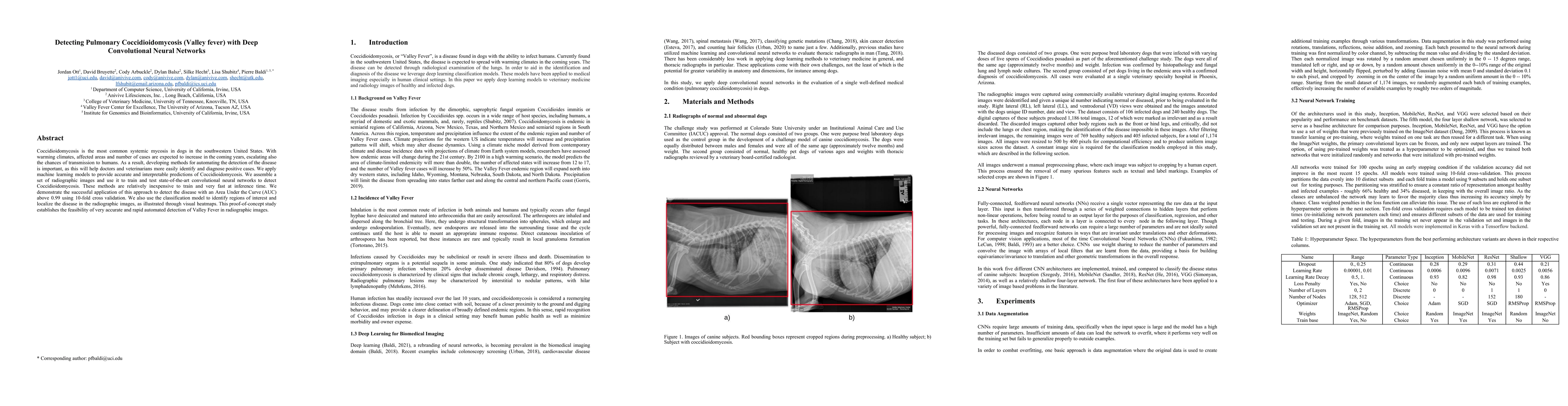 Coccidioidomycosis is the most common systemic mycosis in dogs in the southwestern United States. With warming climates, affected areas and number of cases are expected to increase in the coming years, escalating also the chances of transmission to humans. As a result, developing methods for automating the detection of the disease is important, as this will help doctors and veterinarians more easily identify and diagnose positive cases. We apply machine learning models to provide accurate and interpretable predictions of Coccidioidomycosis. We assemble a set of radiographic images and use it to train and test state-of-the-art convolutional neural networks to detect Coccidioidomycosis. These methods are relatively inexpensive to train and very fast at inference time. We demonstrate the successful application of this approach to detect the disease with an Area Under the Curve (AUC) above 0.99 using 10-fold cross validation. We also use the classification model to identify regions of interest and localize the disease in the radiographic images, as illustrated through visual heatmaps. This proof-of-concept study establishes the feasibility of very accurate and rapid automated detection of Valley Fever in radiographic images.