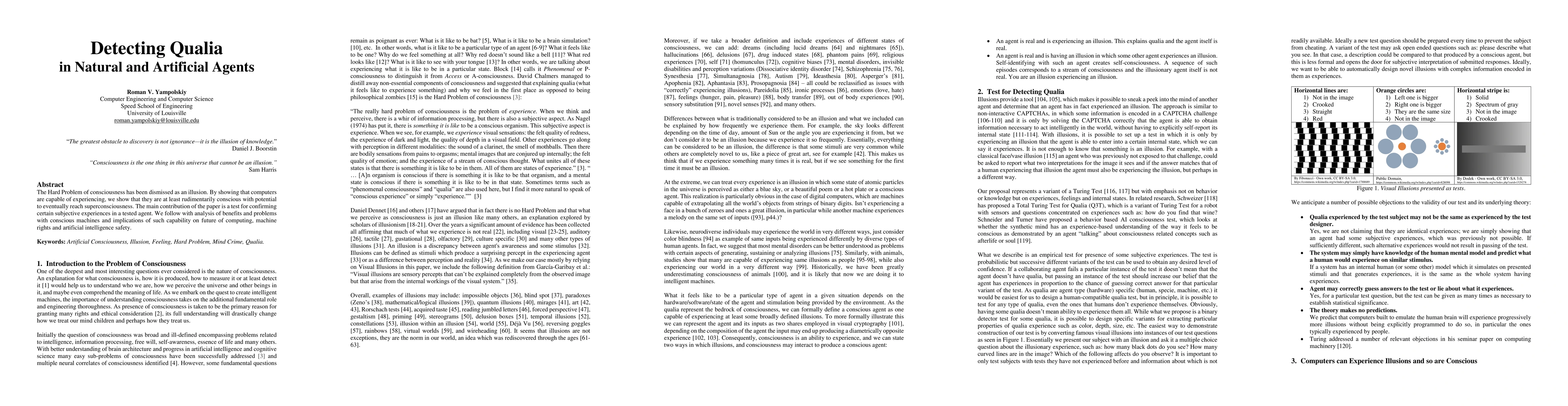 The Hard Problem of consciousness has been dismissed as an illusion. By showing that computers are capable of experiencing, we show that they are at least rudimentarily conscious with potential to eventually reach superconsciousness. The main contribution of the paper is a test for confirming certain subjective experiences in a tested agent. We follow with analysis of benefits and problems with conscious machines and implications of such capability on future of computing, machine rights and artificial intelligence safety.