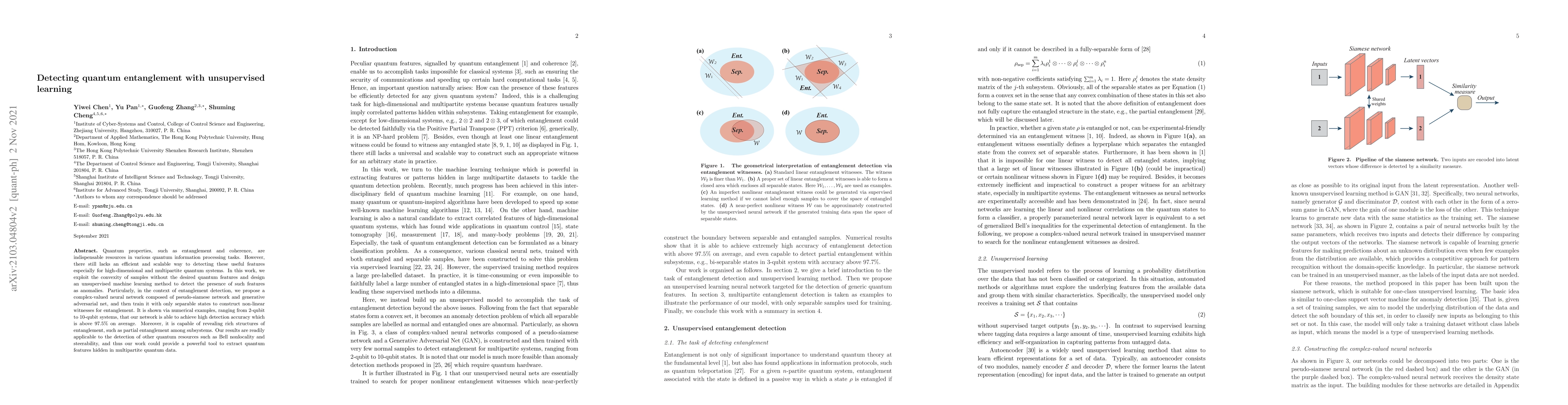 Quantum properties, such as entanglement and coherence, are indispensable resources in various quantum information processing tasks. However, there still lacks an efficient and scalable way to detecting these useful features, especially for high-dimensional and multipartite quantum systems. In this work, we exploit the convexity of samples without the desired quantum features and design an unsupervised machine learning method to detect the presence of such features as anomalies. Particularly, in the context of entanglement detection, we propose a complex-valued neural network composed of pseudo-siamese network and generative adversarial net, and then train it with only separable states to construct non-linear witnesses for entanglement. It is shown via numerical examples, ranging from two-qubit to ten-qubit systems, that our network is able to achieve high detection accuracy which is above 97.5% on average.Moreover, it is capable of revealing rich structures of entanglement, such as partial entanglement among subsystems. Our results are readily applicable to the detection of other quantum resources such as Bell nonlocality and steerability, and thus our work could provide a powerful tool to extract quantum features hidden in multipartite quantum data.