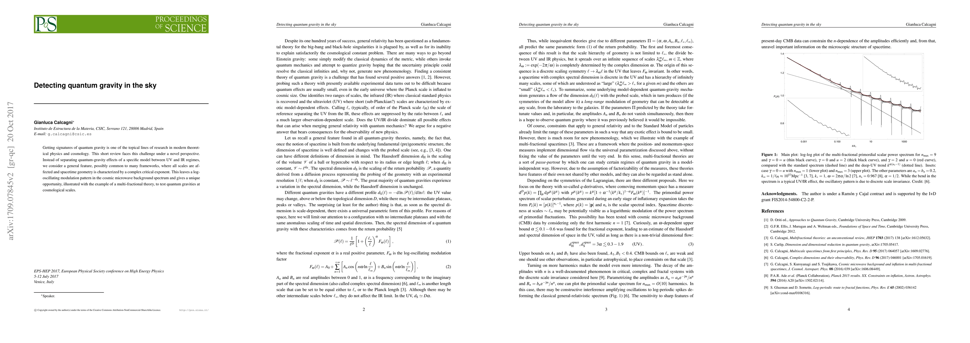 Getting signatures of quantum gravity is one of the topical lines of research in modern theoretical physics and cosmology. This short review faces this challenge under a novel perspective. Instead of separating quantum-gravity effects of a specific model between UV and IR regimes, we consider a general feature, possibly common to many frameworks, where all scales are affected and spacetime geometry is characterized by a complex critical exponent. This leaves a log-oscillating modulation pattern in the cosmic microwave background spectrum and gives a unique opportunity, illustrated with the example of a multi-fractional theory, to test quantum gravities at cosmological scales.