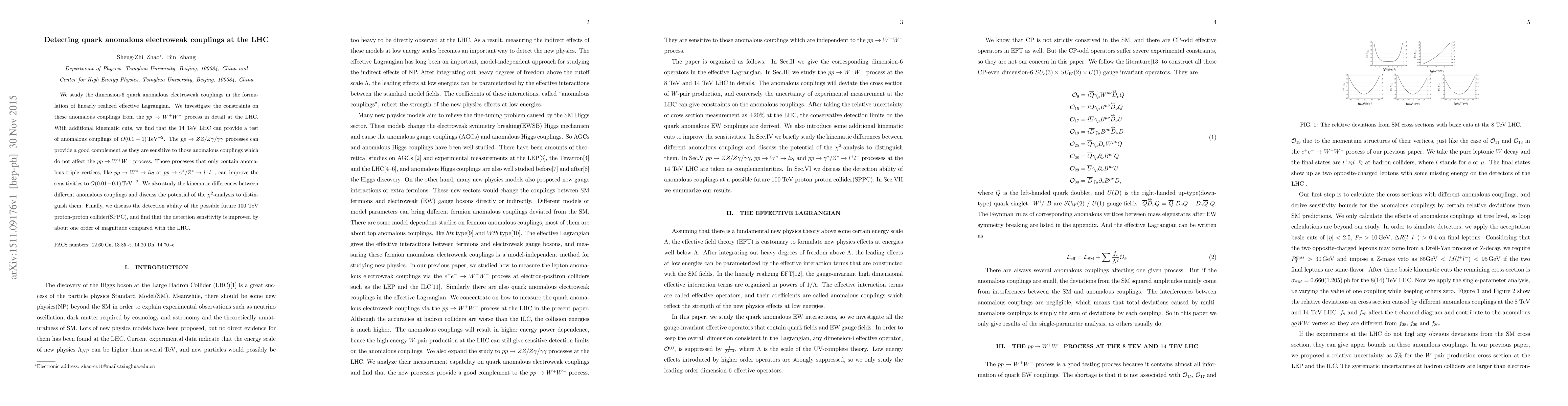 This paper investigates the detection of dimension-6 quark anomalous electroweak couplings at the LHC, focusing on the $pp \rightarrow W^+W^-$ process. It finds that the 14 TeV LHC can test these couplings at the $O(0.1-1)\,{\rm TeV}^{-2}$ level, with complementary sensitivities from other processes like $pp \rightarrow ZZ/Z\gamma/\gamma\gamma$.