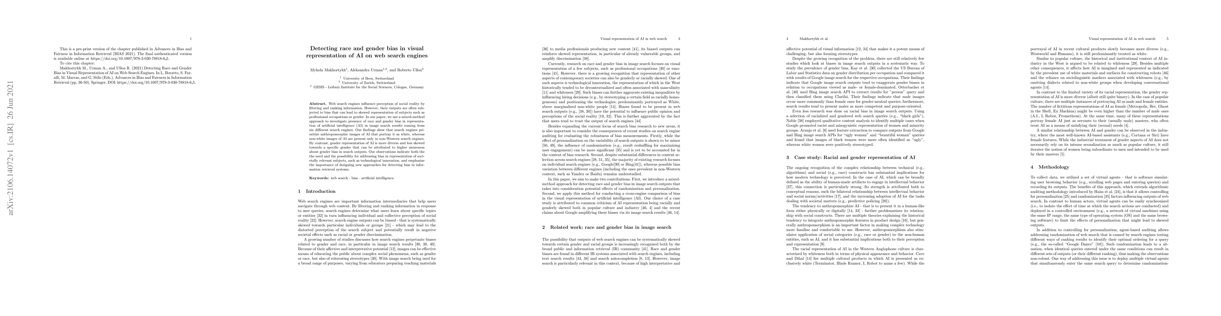 Web search engines influence perception of social reality by filtering and ranking information. However, their outputs are often subjected to bias that can lead to skewed representation of subjects such as professional occupations or gender. In our paper, we use a mixed-method approach to investigate presence of race and gender bias in representation of artificial intelligence (AI) in image search results coming from six different search engines. Our findings show that search engines prioritize anthropomorphic images of AI that portray it as white, whereas non-white images of AI are present only in non-Western search engines. By contrast, gender representation of AI is more diverse and less skewed towards a specific gender that can be attributed to higher awareness about gender bias in search outputs. Our observations indicate both the the need and the possibility for addressing bias in representation of societally relevant subjects, such as technological innovation, and emphasize the importance of designing new approaches for detecting bias in information retrieval systems.