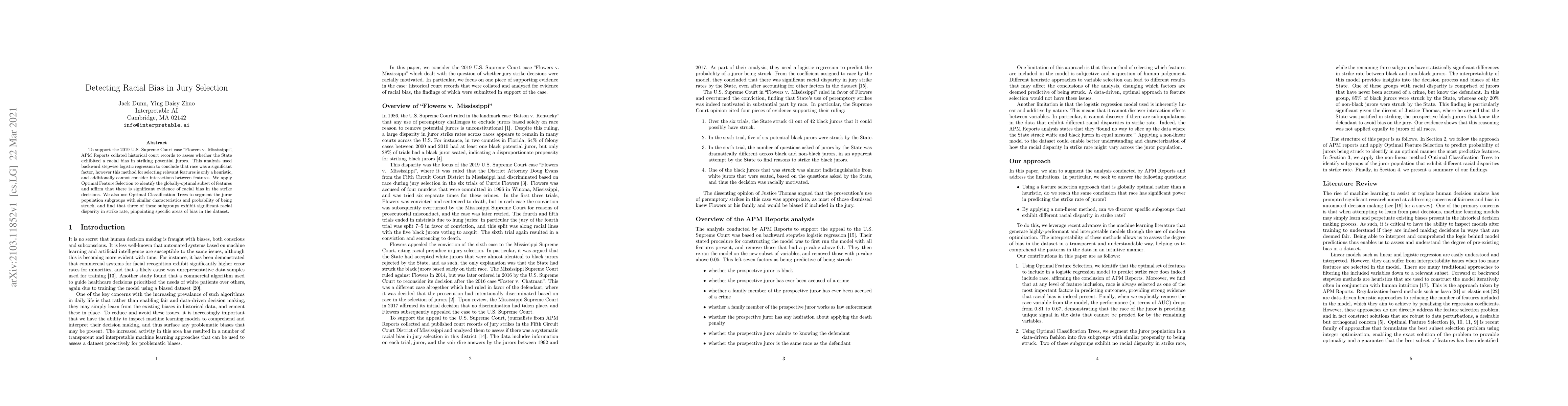 This study analyzes historical court records from the "Flowers v. Mississippi" case to detect racial bias in jury selection, confirming significant racial bias using Optimal Feature Selection and Optimal Classification Trees, which identify three subgroups with notable racial disparities in strike rates. Traditional logistic regression identified race as a factor but lacked the ability to consider feature interactions.