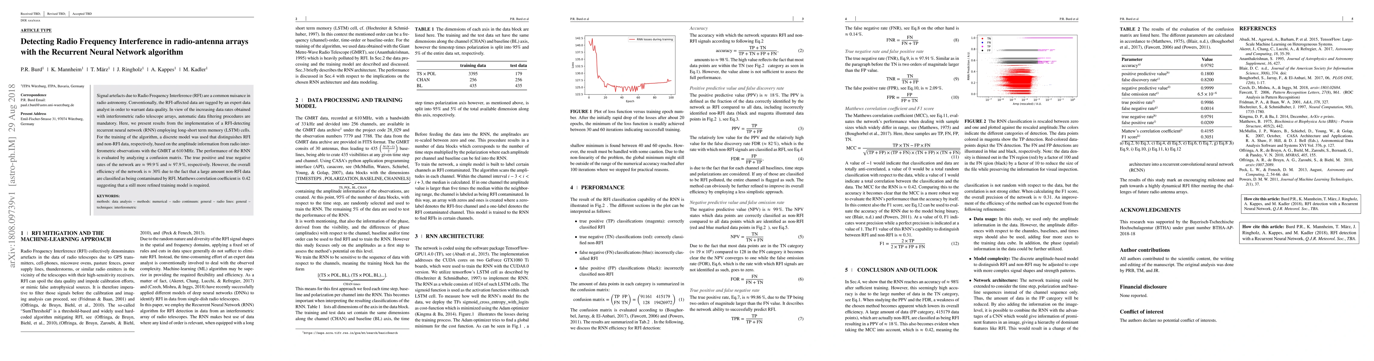 A recurrent neural network algorithm was used to detect Radio Frequency Interference in radio-antenna arrays, achieving true positive and negative rates of around 99.9% and 97.9%, respectively, but with an overall efficiency of approximately 30%.