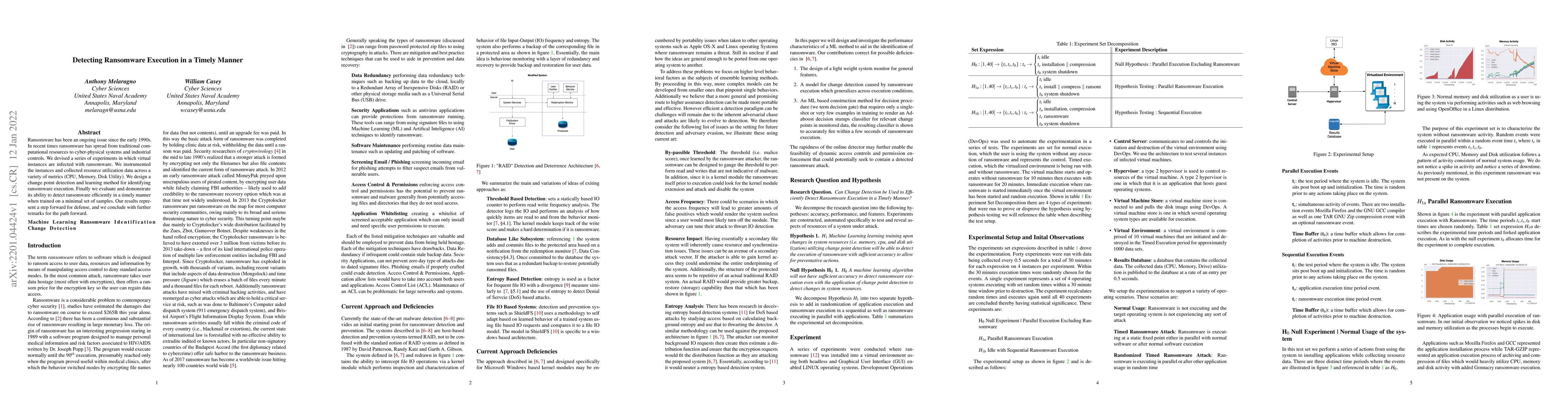 Ransomware has been an ongoing issue since the early 1990s. In recent times ransomware has spread from traditional computational resources to cyber-physical systems and industrial controls. We devised a series of experiments in which virtual instances are infected with ransomware. We instrumented the instances and collected resource utilization data across a variety of metrics (CPU, Memory, Disk Utility). We design a change point detection and learning method for identifying ransomware execution. Finally we evaluate and demonstrate its ability to detect ransomware efficiently in a timely manner when trained on a minimal set of samples. Our results represent a step forward for defense, and we conclude with further remarks for the path forward.