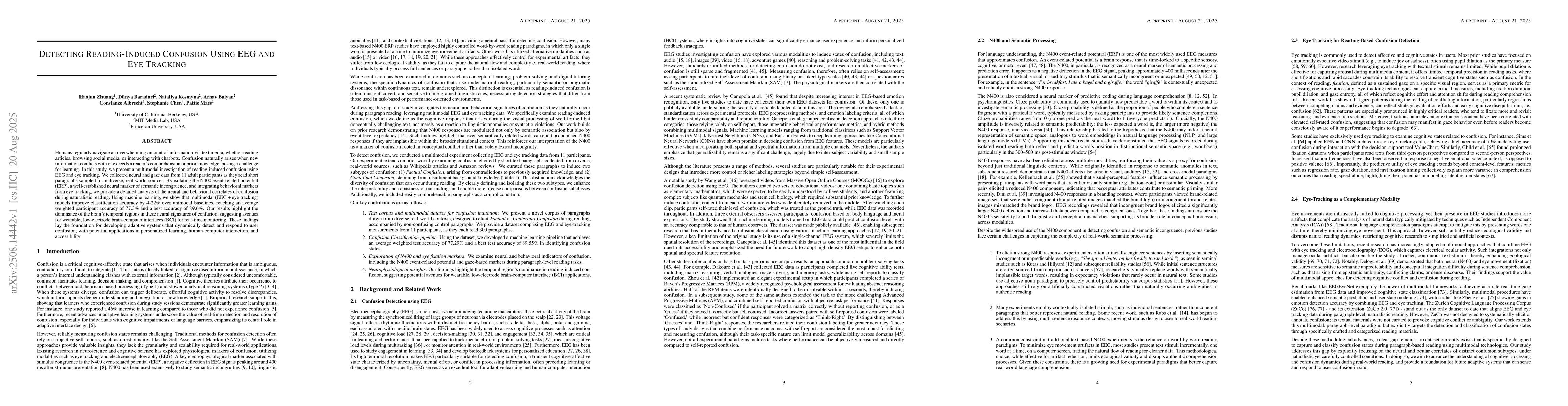 This study uses EEG and eye tracking to identify reading-induced confusion, finding that combining these methods improves accuracy by 4-22%. The research highlights the role of temporal brain regions in confusion, suggesting potential for wearable brain-computer interfaces. It paves the way for adaptive systems in personalized learning and human-computer interaction.