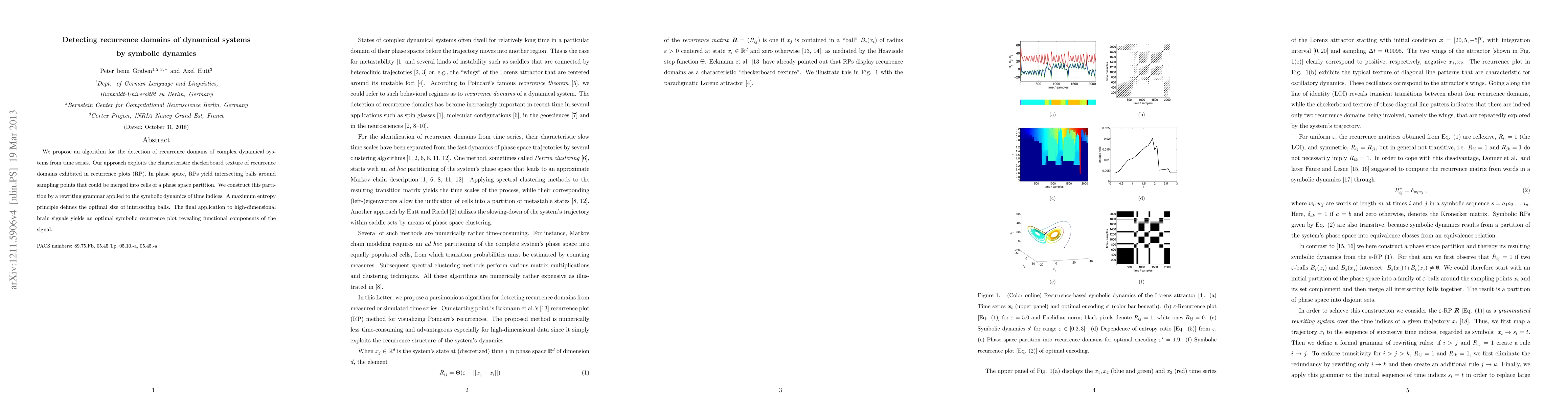This paper introduces an algorithm to detect recurrence domains in complex dynamical systems using time series data. It leverages the checkerboard pattern in recurrence plots and constructs a phase space partition through symbolic dynamics, optimizing the size of intersecting balls via a maximum entropy principle, ultimately applied to brain signals to reveal functional components.